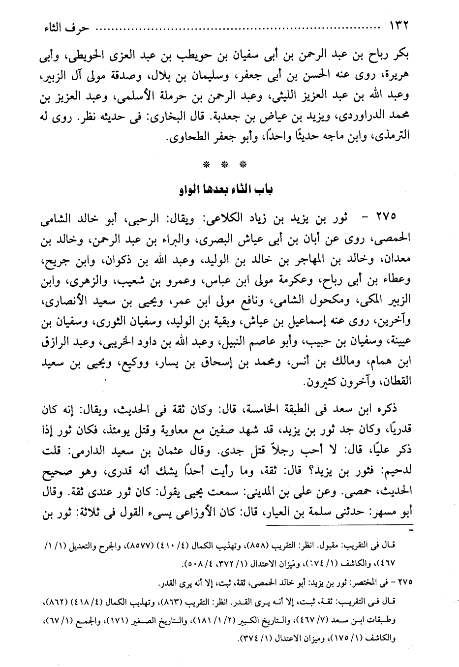 275 - ثور بن يزيد بن زياد الكلاعى: ويقال: الرحبى، أبو خالد الشامى الحمصى، روى عن أبان بن أبى عياش البصرى، والبراء بن عبد الرحمن، وخالد بن معدان، وخالد بن المهاجر بن خالد بن الوليد، وعبد الله بن ذكوان، وابن جريح، وعطاء بن أبى رباح، وعكرمة مولى ابن عباس، وعمرو بن شعيب، والزهرى، وابن الزبير المكى، ومكحول الشامى، ونافع مولى ابن عمر، ويحيى بن سعيد الأنصارى، وآخرين، روى عنه إسماعيل بن عياش، وبقية بن الوليد، وسفيان الثورى، وسفيان بن عيينة، وسفيان بن حبيب، وأبو عاصم النبيل، وعبد الله بن داود الخريبى، وعبد الرازق ابن همام، ومالك بن أنس، ومحمد بن إسحاق بن يسار، ووكيع، ويحيى بن سعيد القطان، وآخرون كثيرون.