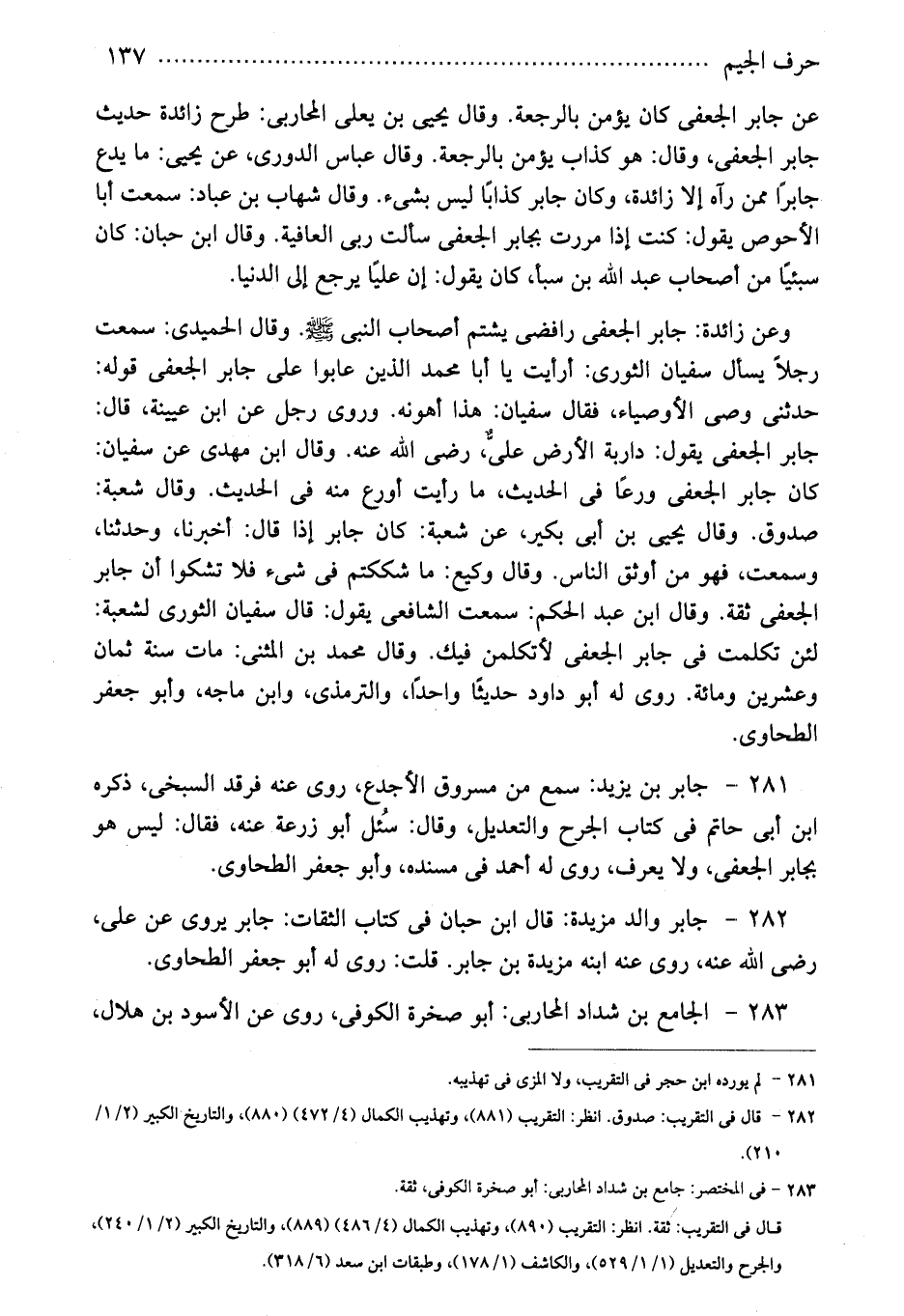 عن جابر الجعفى كان يؤمن بالرجعة. وقال يحيى بن يعلى المحاربى: طرح زائدة حديث جابر الجعفى، وقال: هو كذاب يؤمن بالرجعة. وقال عباس الدورى، عن يحيى: ما يدع جابرًا ممن رآه إلا زائدة، وكان جابر كذابًا ليس بشىء. وقال شهاب بن عباد: سمعت أبا الأحوص يقول: كنت إذا مررت بجابر الجعفى سألت ربى العافية. وقال ابن حبان: كان سبئيًا من أصحاب عبد الله بن سبأ، كان يقول: إن عليًا يرجع إلى الدنيا.