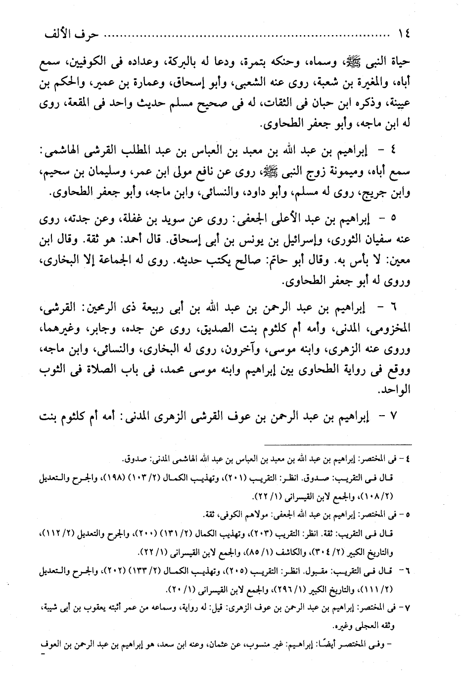 6 - إبراهيم بن عبد الرحمن بن عبد الله بن أبى ربيعة ذى الرمحين: القرشى، المخزومى، المدنى، وأمه أم كلثوم بنت الصديق، روى عن جده، وجابر، وغيرهما، وروى عنه الزهرى، وابنه موسى، وآخرون، روى له البخارى، والنسائى، وابن ماجه، ووقع فى رواية الطحاوى بين إبراهيم وابنه موسى محمد، فى باب الصلاة فى الثوب الواحد.
