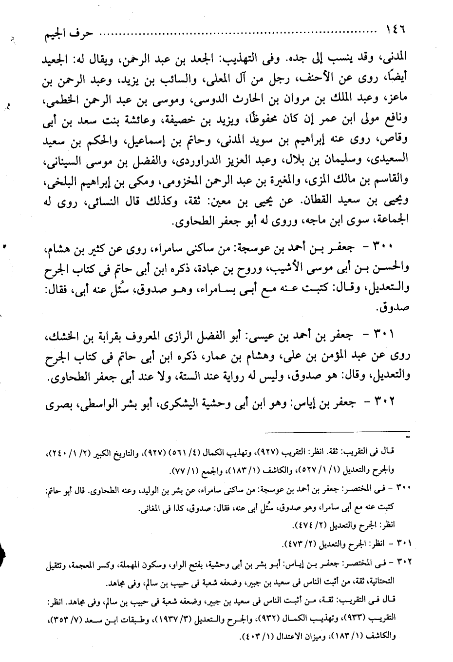 300 - جعفر بن أحمد بن عوسجة: من ساكنى سامراء، روى عن كثير بن هشام، والحسن بن أبى موسى الأشيب، وروح بن عبادة، ذكره ابن أبى حاتم فى كتاب الجرح والتعديل، وقال: كتبت عنه مع أبى بسامراء، وهو صدوق، سُئل عنه أبى، فقال: صدوق.