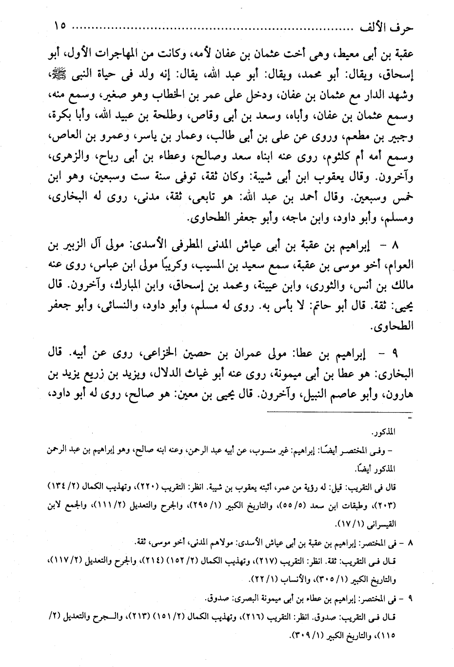 8 - إبراهيم بن عقبة بن أبى عياش المدنى المطرفى الأسدى: مولى آل الزبير بن العوام، أخو موسى بن عقبة، سمع سعيد بن المسيب، وكريبًا مولى ابن عباس، روى عنه مالك بن أنس، والثورى، وابن عيينة، ومحمد بن إسحاق، وابن المبارك، وآخرون. قال يحيى: ثقة. قال أبو حاتم: لا بأس به. روى له مسلم، وأبو داود، والنسائى، وأبو جعفر الطحاوى.