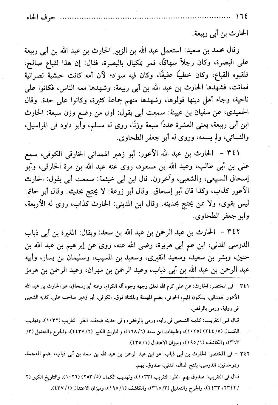 341 - فى المختصر: الحارث: عن على كرم الله تعالى وجهه وجوه آله الكرام، وعنه أبو إسحاق، هو الحارث بن عبد الله الأعور الهمدانى، بسكون الميم، الحوتى، بضم المهملة وبالمثناة فوق، الكوفى، أبو زهير صاحب على، كذبه الشعبى فى رواية، ورمى بالرفض.