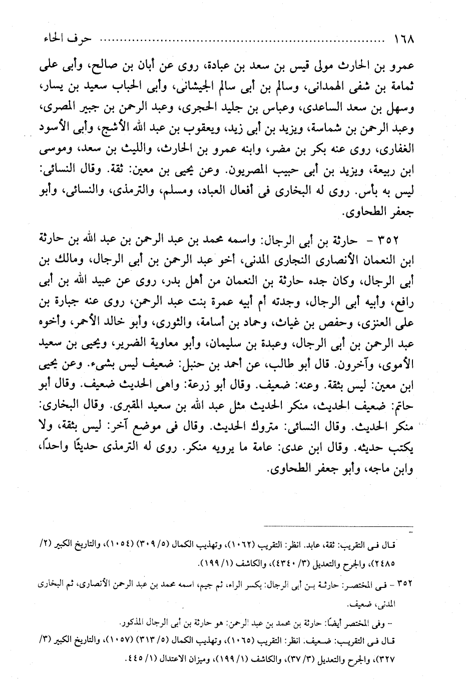 352 - فى المختصر: حارثة بن أبى الرجال: بكسر الراء، ثم جيم، اسمه محمد بن عبد الرحمن الأنصارى، ثم البخارى المدنى، ضعيف.