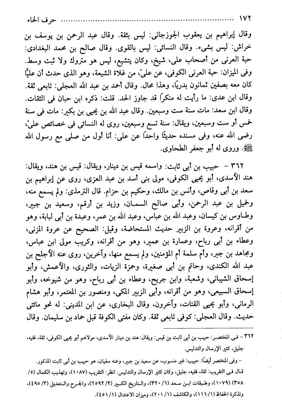 362 - حبيب بن أبى ثابت: واسمه قيس بن دينار، ويقال: قيس بن هند، ويقال: هند الأسدى، أبو يحيى الكوفى، مولى بنى أسد بن عبد العزى، روى عن إبراهيم بن سعد بن أبى وقاص، وأنس بن مالك، وحكيم بن حزام. قال الترمذى: ولم يسمع منه، وخميل بن عبد الرحمن، وأبى صالح السمان، وزيد بن أرقم، وسعيد بن جبير، وطاووس بن كيسان، وعبد الله بن عباس، وعبد الله بن عمر، وعبدة بن أبى لبابة، وهو من أقرانه، وعروة بن الزبير حديث المستحاضة، وقيل: الصحيح عن عروة المزنى، وعطاء بن أبى رباح، وعمارة بن عمير، وهو من أقرانه، وكريب مولى ابن عباس، ومجاهد بن جبر، وأم سلمة أم المؤمنين، ولم يسمع منها، وآخرين، روى عنه الأجلح بن عبد الله الكندى، وحاتم بن أبى صغيرة، وحمزة الزيات، والثورى، والأعمش، وأبو إسحاق الشيبانى، وشعبة، وابن جريح، وعطاء بن أبى رباح، وهو من شيوخه، وأبو إسحاق السبيعى، وهو من أقرانه، وأبى الزبير المكى، ومنصور بن المعتمر، وأبو هشام الرمانى، وأبو يحيى القتات، وآخرون، وقال البخارى، عن ابن المدينى: له نحو مائتى حديث. وقال العجلى: كوفى تابعى ثقة. وكان مفتى الكوفة قبل حماد بن سليمان. وقال