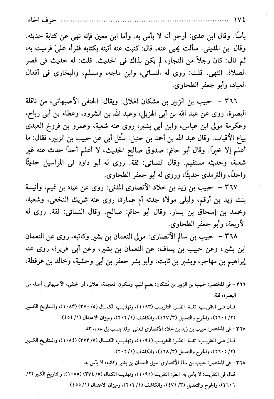 366 - فى المختصر: حبيب بن الزبير بن مُشكان: بضم الميم، وسكون المعجمة، الهلالى، أو الحنفى، الأصبهانى، أصله من البصرة، ثقة.