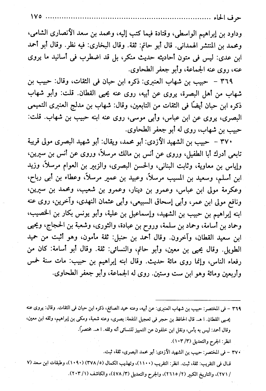 369 - حبيب بن شهاب العنبرى: ذكره ابن حبان فى الثقات، وقال: حبيب بن شهاب من أهل البصرة، يروى عن أبيه، روى عنه يحيى القطان. قلت: وأبو شهاب ذكره ابن حبان أيضًا فى الثقات من التابعين، وقال: شهاب بن مدلج العنبرى التميمى البصرى، يروى عن ابن عباس، وأبى موسى، روى عنه ابنه حبيب بن شهاب. قلت: حبيب بن شهاب، روى له أبو جعفر الطحاوى.