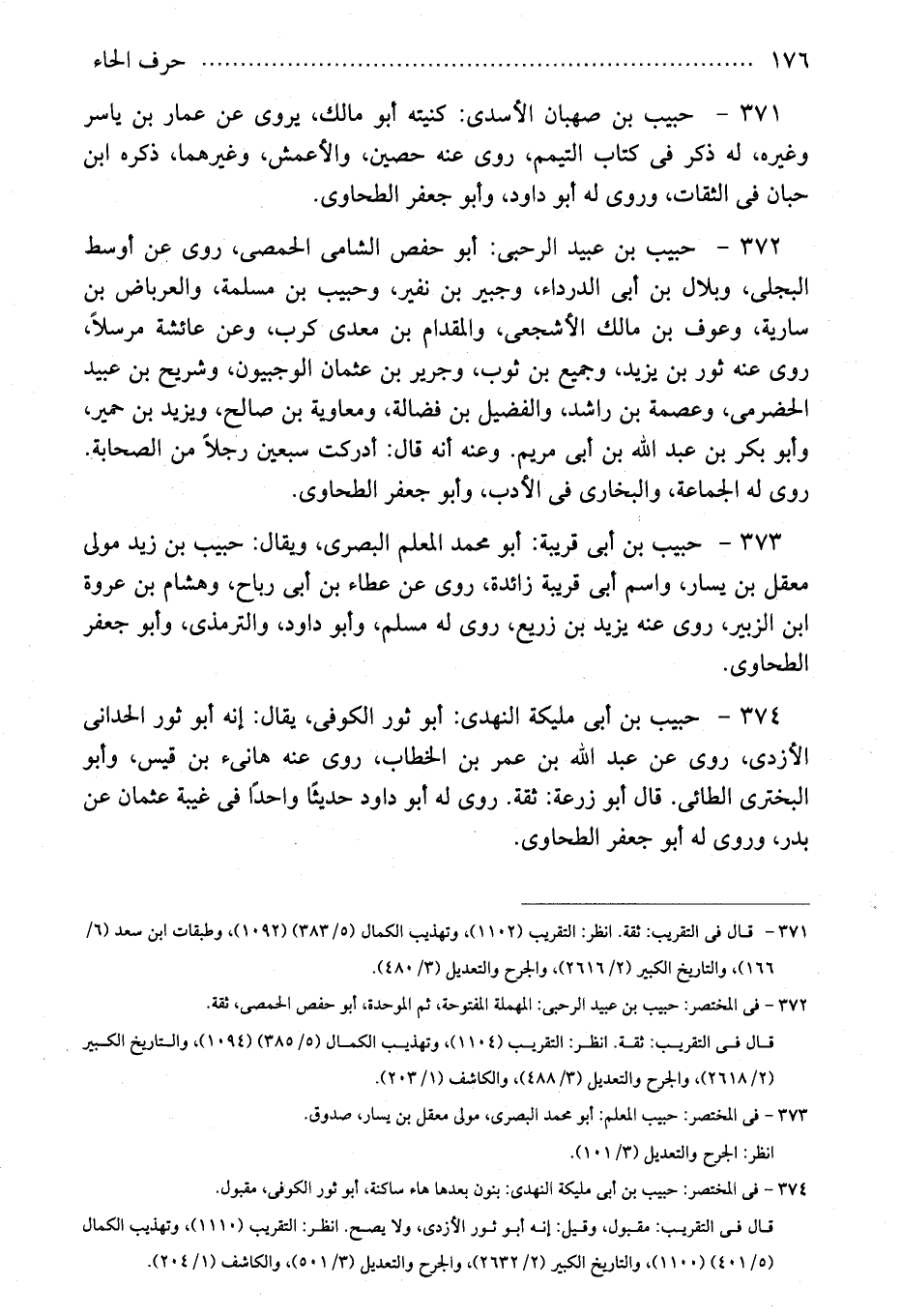 374 - حبيب بن أبى مليكة النهدى: أبو ثور الكوفى، يقال: إنه أبو ثور الحدانى الأزدى، روى عن عبد الله بن عمر بن الخطاب، روى عنه هانىء بن قيس، وأبو البخترى الطائى. قال أبو زرعة: ثقة. روى له أبو داود حديثًا واحدًا فى غيبة عثمان عن بدر، وروى له أبو جعفر الطحاوى.