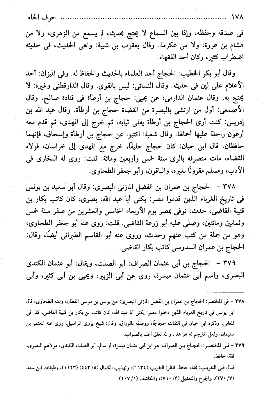 378 - فى المختصر: الحجاج بن عمران بن الفضل المازنى البصرى: عن يونس بن موسى القطان، وعنه الطحاوى، قال ابن يونس فى تاريخ الغرباء الذين دخلوا مصر: يكنى أبا عبد الله، كان كاتب بن بكار بن قتيبة القاضى، كذا فى المغانى، وذكره ابن حبان فى الثقات حجاجًا، ووصفه بالوراق، وقال: شيخ يروى المراسيل، روى عنه المعتمر بن سليمان، ولعل المترجم له هو هذا، والله تعالى أعلم بالصواب.