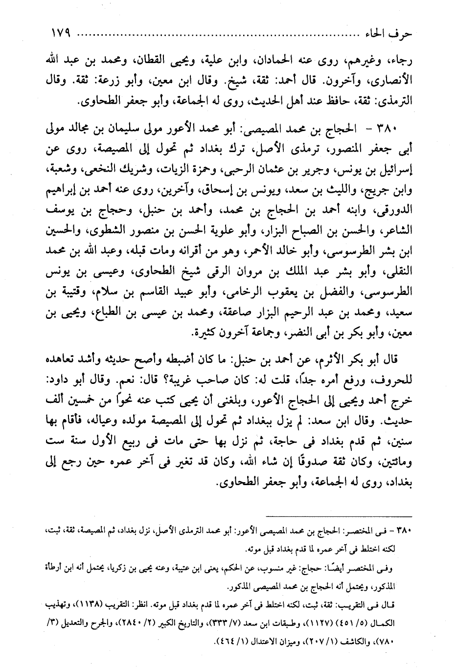 380 - الحجاج بن محمد المصيصى: أبو محمد الأعور مولى سليمان بن مجالد مولى أبى جعفر المنصور، ترمذى الأصل، ترك بغداد ثم تحول إلى المصيصة، روى عن إسرائيل بن يونس، وجرير بن عثمان الرحبى، وحمزة الزيات، وشريك النخعى، وشعبة، وابن جريج، والليث بن سعد، ويونس بن إسحاق، وآخرين، روى عنه أحمد بن إبراهيم الدورقى، وابنه أحمد بن الحجاج بن محمد، وأحمد بن حنبل، وحجاج بن يوسف الشاعر، والحسن بن الصباح البزار، وأبو علوية الحسن بن منصور الشطوى، والحسين ابن بشر الطرسوسى، وأبو خالد الأحمر، وهو من أقرانه ومات قبله، وعبد الله بن محمد النقلى، وأبو بشر عبد الملك بن مروان الرقى شيخ الطحاوى، وعيسى بن يونس الطرسوسى، والفضل بن يعقوب الرخامى، وأبو عبيد القاسم بن سلام، وقتيبة بن سعيد، ومحمد بن عبد الرحيم البزار صاعقة، ومحمد بن عيسى بن الطباع، ويحيى بن معين، وأبو بكر بن أبى النضر، وجماعة آخرون كثيرة.