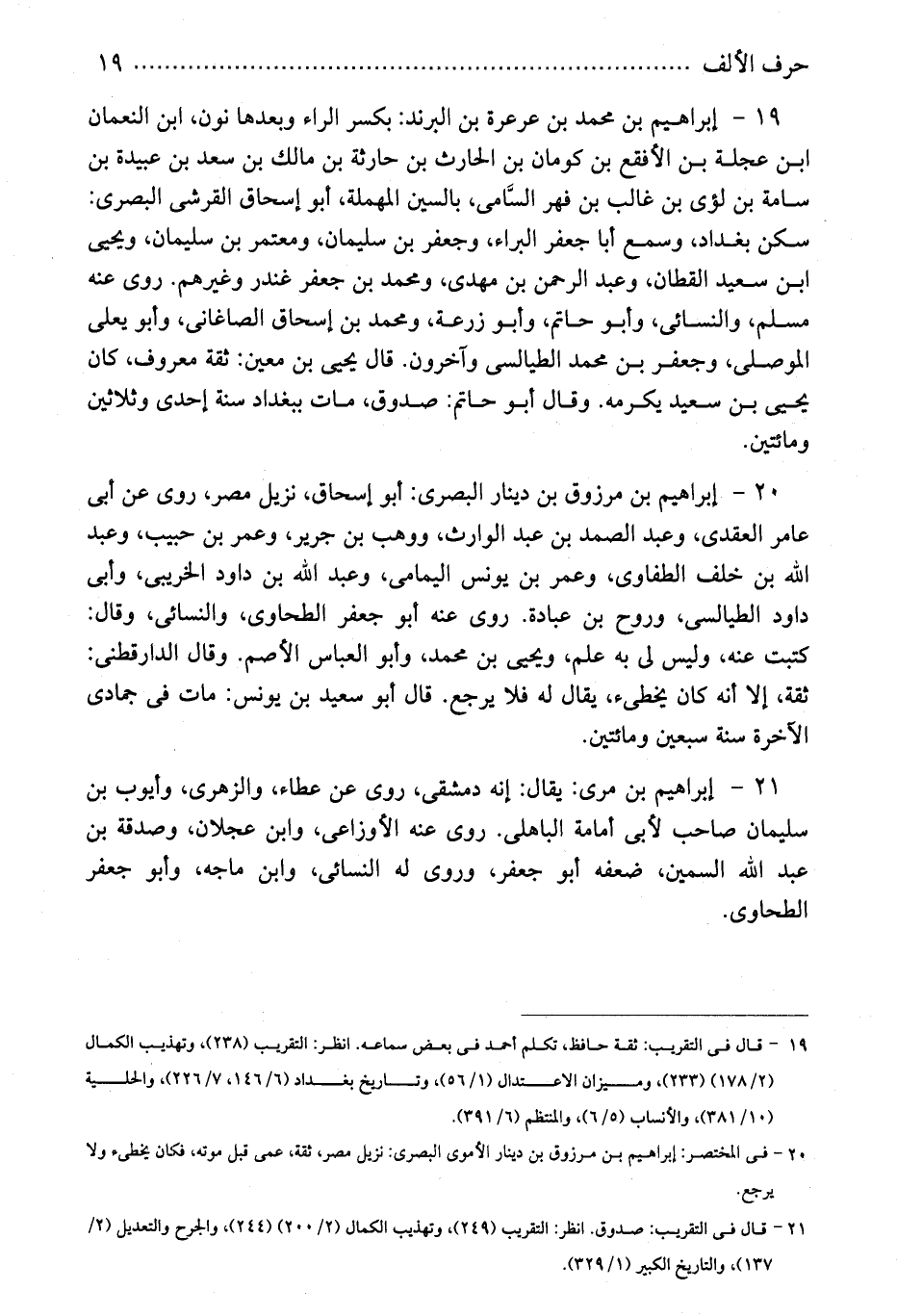 19 - قال فى التقريب: ثقة حافظ، تكلم أحمد فى بعض سماعه. انظر: التقريب (238) ، وتهذيب الكمال (2/178) (233) ، وميزان الاعتدال (1/56) ، وتاريخ بغداد (6/146، 7/226) ، والحلية (10/381) ، والأنساب (5/6) ، والمنتظم (6/391) .