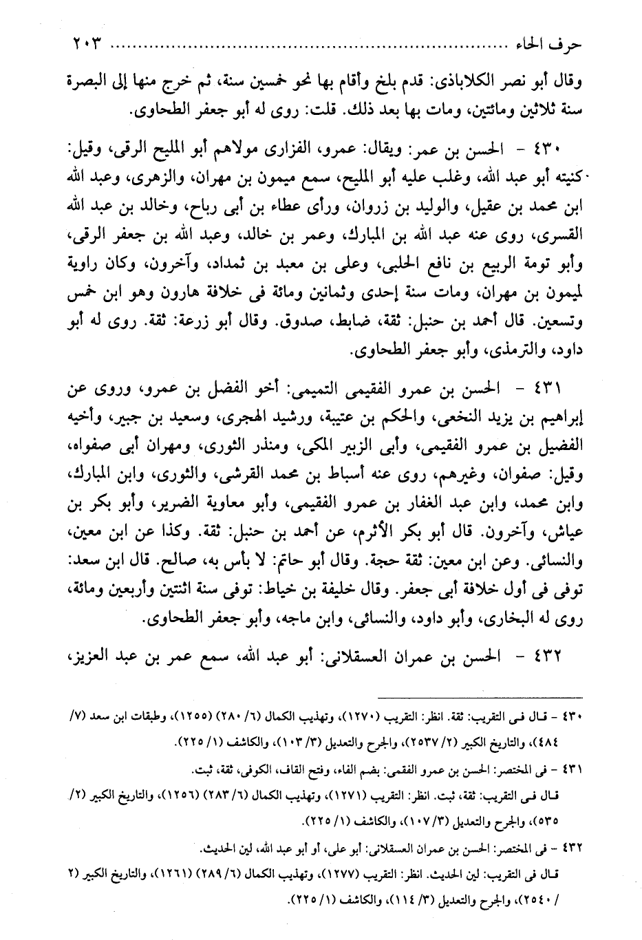 430 - الحسن بن عمر: ويقال: عمرو، الفزارى مولاهم أبو المليح الرقى، وقيل: كنيته أبو عبد الله، وغلب عليه أبو المليح، سمع ميمون بن مهران، والزهرى، وعبد الله ابن محمد بن عقيل، والوليد بن زروان، ورأى عطاء بن أبى رباح، وخالد بن عبد الله القسرى، روى عنه عبد الله بن المبارك، وعمر بن خالد، وعبد الله بن جعفر الرقى، وأبو تومة الربيع بن نافع الحلبى، وعلى بن معبد بن ثمداد، وآخرون، وكان راوية لميمون بن مهران، ومات سنة إحدى وثمانين ومائة فى خلافة هارون وهو ابن خمس وتسعين. قال أحمد بن حنبل: ثقة، ضابط، صدوق. وقال أبو زرعة: ثقة. روى له أبو داود، والترمذى، وأبو جعفر الطحاوى.