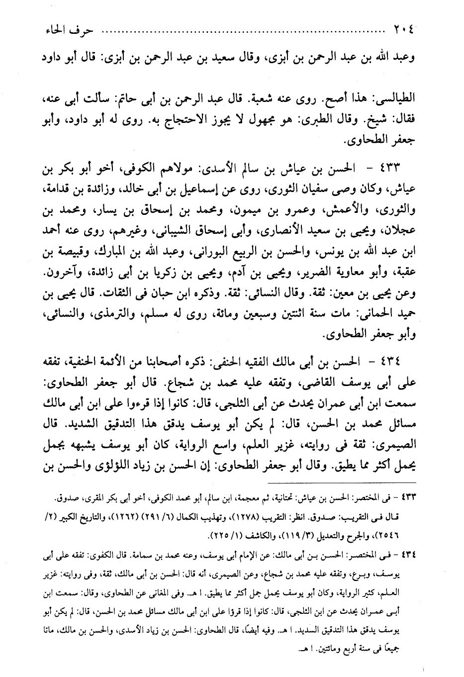 433 - الحسن بن عياش بن سالم الأسدى: مولاهم الكوفى، أخو أبو بكر بن عياش، وكان وصى سفيان الثورى، روى عن إسماعيل بن أبى خالد، وزائدة بن قدامة، والثورى، والأعمش، وعمرو بن ميمون، ومحمد بن إسحاق بن يسار، ومحمد بن عجلان، ويحيى بن سعيد الأنصارى، وأبى إسحاق الشيبانى، وغيرهم، روى عنه أحمد ابن عبد الله بن يونس، والحسن بن الربيع البورانى، وعبد الله بن المبارك، وقبيصة بن عقبة، وأبو معاوية الضرير، ويحيى بن آدم، ويحيى بن زكريا بن أبى زائدة، وآخرون. وعن يحيى بن معين: ثقة. وقال النسائى: ثقة. وذكره ابن حبان فى الثقات. قال يحيى بن حميد الحمانى: مات سنة اثنتين وسبعين ومائة، روى له مسلم، والترمذى، والنسائى، وأبو جعفر الطحاوى.