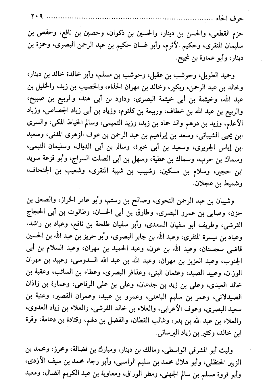 وشيبان بن عبد الرحمن النحوى، وصالح بن رستم، وأبو عامر الخراز، والصعق بن حزن، وصابى بن عمرو البصرى، وطارق بن أبى الحسان، وطالوت بن أبى الحجاج القرشى، وطريف أبو سفيان السعدى، وأبو سفيان طلحة بن نافع، وعباد بن راشد، وعباد بن ميسرة المنقرى، وعبد الله بن جابر البصرى، وأبو حريز بن عبد الله بن الحسين قاضى سجستان، وعبد الله بن عون، وعبد الحميد بن مهران، وعبد السلام بن أبى الجنوب، وعبد العزيز بن مهران، وعبد الله بن عبد الله السدوسى، وعبيد بن مهران الوزان، وعبيد الصيد، وعثمان البتى، وعذافر البصرى، وعطاء بن السائب، وعقبة بن خالد العبدى، وعلى بن زيد بن جدعان، وعلى بن على الرفاعى، وعمارة بن زاذان الصيدلانى، وعمر بن سليم الباهلى، وعمرو بن عبيد، وعمران القصير، وعنبة بن سعيد البصرى، وعوف الأعرابى، والعلاء بن خالد القرشى، والعلاء بن زياد العدوى، والعلاء بن عبد الله بن بدر، وغالب القطان، والفضل بن دلهم، وقتادة بن دعامة، وقرة ابن خالد، وكثير بن زياد البرسانى.