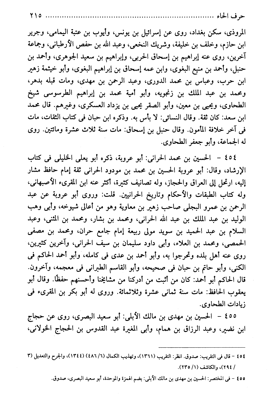 454 - الحسين بن محمد الحرانى: أبو عروبة، ذكره أبو يعلى الخليلى فى كتاب الإرشاد، وقال: أبو عروبة الحسين بن محمد بن مودود الحرانى ثقة إمام حافظ مشار إليه، ارتحل إلى العراق والحجاز، وله تصانيف كثيرة، أكثر عنه ابن المقرىء الأصبهانى، وله كتاب الطبقات والأحكام وتاريخ الحرانيين. قلت: وروى أبو عروبة عن عبد الرحمن بن عمرو البجلى صاحب زهير بن معاوية وهو من أعالى شيوخه، وأبى وهب الوليد بن عبد الملك بن عبد الله الحرانى، ومحمد بن بشار، ومحمد بن المثنى، وعبد السلام بن عبد الحميد بن سويد مولى ربيعة إمام جامع حران، ومحمد بن مصفى الحمصى، ومحمد بن العلاء، وأبى داود سليمان بن سيف الحرانى، وآخرين كثيرين، روى عنه أهل بلده وتحرجوا به، وأبو أحمد بن عدى فى كامله، وأبو أحمد الحاكم فى الكنى، وأبو حاتم بن حبان فى صحيحه، وأبو القاسم الطبرانى فى معجمه، وآخرون. قال الحاكم أبو أحمد: كان من أثبت من أدركنا من مشايخنا وأحسنهم حفظًا. وقال أبو يعقوب الحافظ: مات سنة ثمانى عشرة وثلاثمائة. وروى له أبو بكر بن المقرىء فى زيادات الطحاوى.