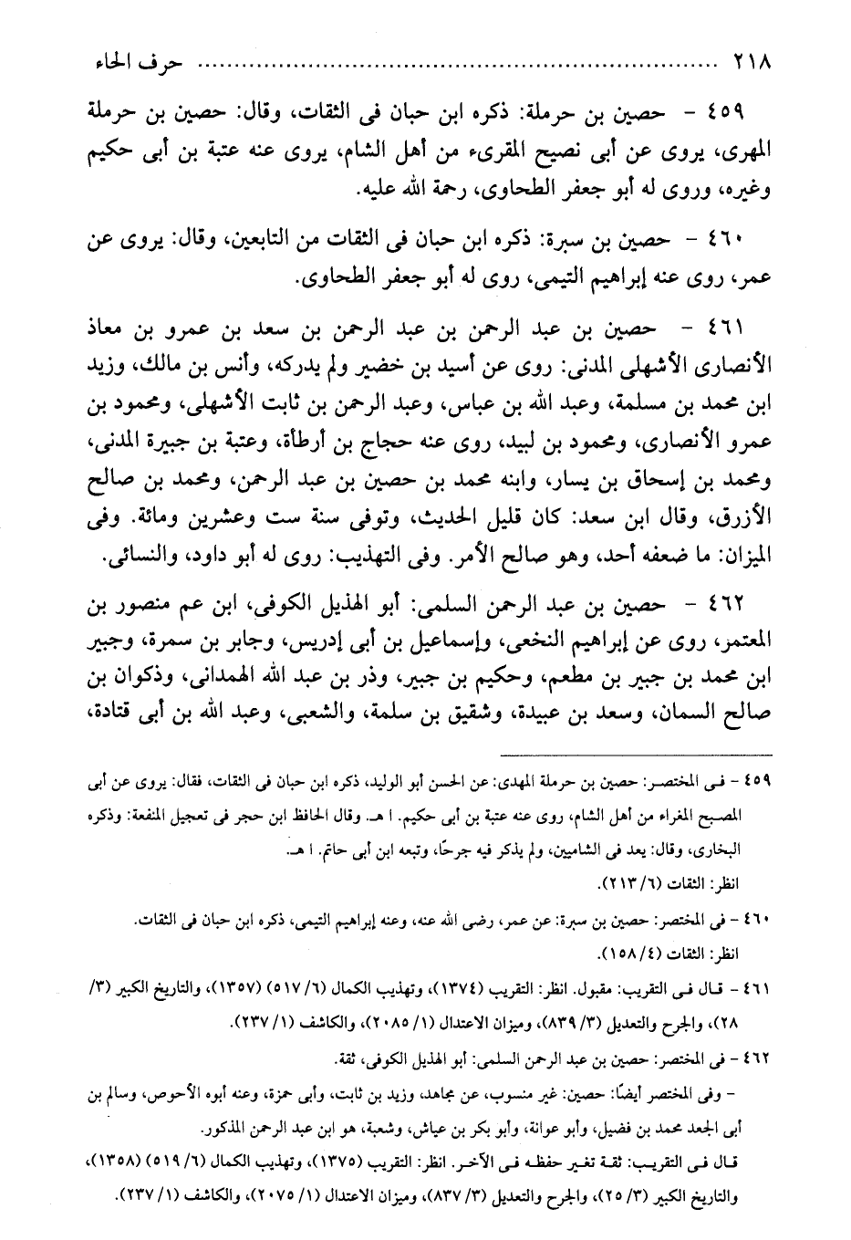 459 - فى المختصر: حصين بن حرملة المهدى: عن الحسن أبو الوليد، ذكره ابن حبان فى الثقات، فقال: يروى عن أبى المصبح المغراء من أهل الشام، روى عنه عتبة بن أبى حكيم. ا. هـ. وقال الحافظ ابن حجر فى تعجيل المنفعة: وذكره البخارى، وقال: يعد فى الشاميين، ولم يذكر فيه جرحًا، وتبعه ابن أبى حاتم. ا. هـ.