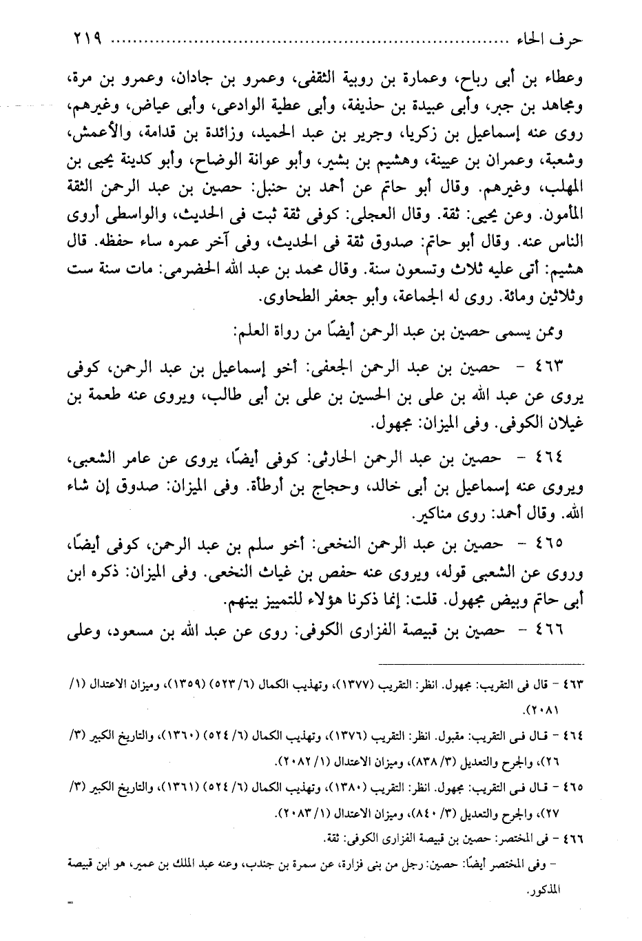 464 - حصين بن عبد الرحمن الحارثى: كوفى أيضًا، يروى عن عامر الشعبى، ويروى عنه إسماعيل بن أبى خالد، وحجاج بن أرطأة. وفى الميزان: صدوق إن شاء الله. وقال أحمد: روى مناكير.