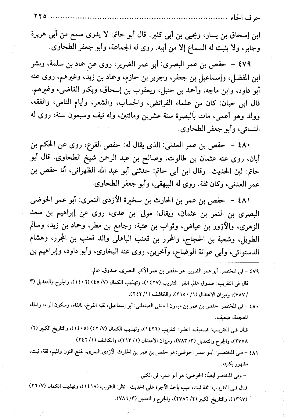 479 - حفص بن عمر البصرى: أبو عمر الضرير، روى عن حماد بن سلمة، وبشر ابن المفضل، وإسماعيل بن جعفر، وجرير بن حازم، وحماد بن زيد، وغيرهم، روى عنه أبو داود، وابن ماجه، وأحمد بن حنبل، ويعقوب بن إسحاق، وبكار القاضى، وغيرهم. قال ابن حبان: كان من علماء الفرائض، والحساب، والشعر، وأيام الناس، والفقه، وولد وهو أعمى، مات بالبصرة سنة عشرين ومائتين، وله نيف وسبعون سنة، روى له النسائى، وأبو جعفر الطحاوى.