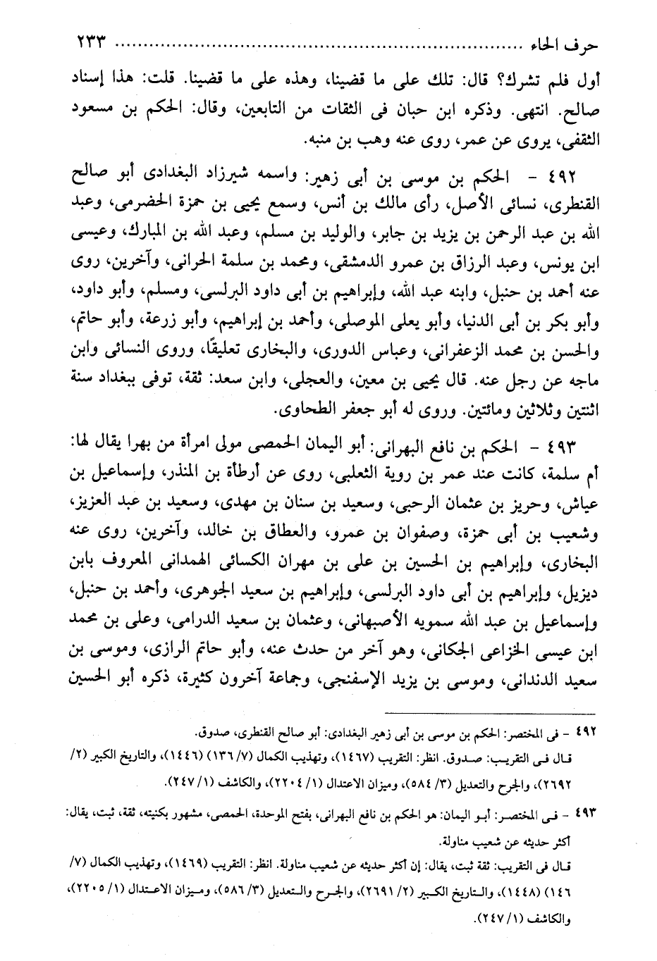493 - الحكم بن نافع البهرانى: أبو اليمان الحمصى مولى امرأة من بهرا يقال لها: أم سلمة، كانت عند عمر بن روية الثعلبى، روى عن أرطأة بن المنذر، وإسماعيل بن عياش، وحريز بن عثمان الرحبى، وسعيد بن سنان بن مهدى، وسعيد بن عبد العزيز، وشعيب بن أبى حمزة، وصفوان بن عمرو، والعطاق بن خالد، وآخرين، روى عنه البخارى، وإبراهيم بن الحسين بن على بن مهران الكسائى الهمدانى المعروف بابن ديزيل، وإبراهيم بن أبى داود البرلسى، وإبراهيم بن سعيد الجوهرى، وأحمد بن حنبل، وإسماعيل بن عبد الله سمويه الأصبهانى، وعثمان بن سعيد الدرامى، وعلى بن محمد ابن عيسى الخزاعى الجكانى، وهو آخر من حدث عنه، وأبو حاتم الرازى، وموسى بن سعيد الدندانى، وموسى بن يزيد الإسفنجى، وجماعة آخرون كثيرة، ذكره أبو الحسين