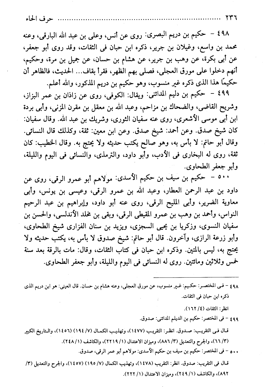 498 - فى المختصر: حكيم: غير منسوب، عن مورق العجلى، وعنه هشام بن حسان. قال العينى: هو ابن دريم الذى ذكره ابن حبان فى الثقات.