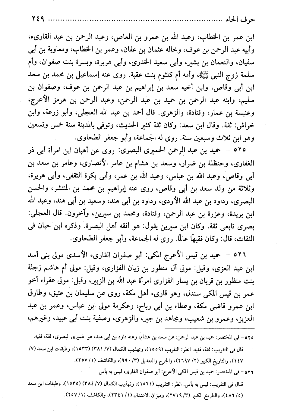 525 - حميد بن عبد الرحمن الحميرى البصرى: روى عن أهبان ابن امرأة أبى ذر الغفارى، وحنظلة بن ضرار، وسعد بن هشام بن عامر الأنصارى، وعامر بن سعد بن أبى وقاص، وعبد الله بن عباس، وعبد الله بن عمر، وأبى بكرة الثقفى، وأبى هريرة، وثلاثة من ولد سعد بن أبى وقاص، روى عنه إبراهيم بن محمد بن المنتشر، والحسن البصرى، وداود بن عبد الله الأودى، وداود بن أبى هند، وسعيد بن أبى هند، وعبد الله ابن بريدة، وعزرة بن عبد الرحمن، وقتادة، ومحمد بن سيرين، وآخرون. قال العجلى: بصرى تابعى ثقة. وكان ابن سيرين يقول: هو أفقه أهل البصرة. وذكره ابن حبان فى الثقات، قال: وكان فقيهًا عالمًا. روى له الجماعة، وأبو جعفر الطحاوى.