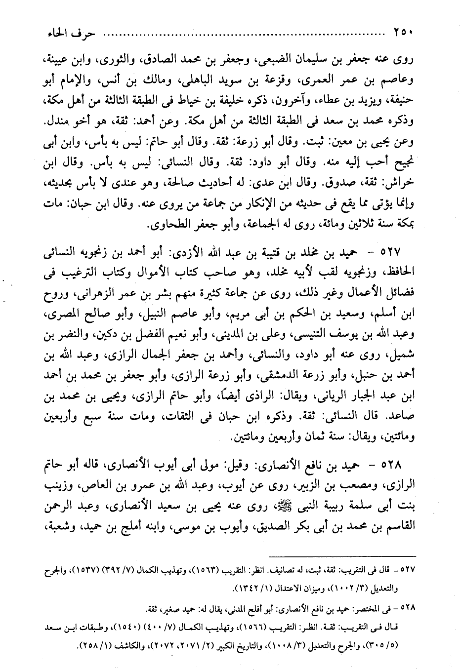 527 - حميد بن مخلد بن قتيبة بن عبد الله الأزدى: أبو أحمد بن زنجويه النسائى الحافظ، وزنجويه لقب لأبيه مخلد، وهو صاحب كتاب الأموال وكتاب الترغيب فى فضائل الأعمال وغير ذلك، روى عن جماعة كثيرة منهم بشر بن عمر الزهرانى، وروح ابن أسلم، وسعيد بن الحكم بن أبى مريم، وأبو عاصم النبيل، وأبو صالح المصرى، وعبد الله بن يوسف التنيسى، وعلى بن المدينى، وأبو نعيم الفضل بن دكين، والنضر بن شميل، روى عنه أبو داود، والنسائى، وأحمد بن جعفر الجمال الرازى، وعبد الله بن أحمد بن حنبل، وأبو زرعة الدمشقى، وأبو زرعة الرازى، وأبو جعفر بن محمد بن أحمد ابن عبد الجبار الريانى، ويقال: الراذى أيضًا، وأبو حاتم الرازى، ويحيى بن محمد بن صاعد. قال النسائى: ثقة. وذكره ابن حبان فى الثقات، ومات سنة سبع وأربعين ومائتين، ويقال: سنة ثمان وأربعين ومائتين.