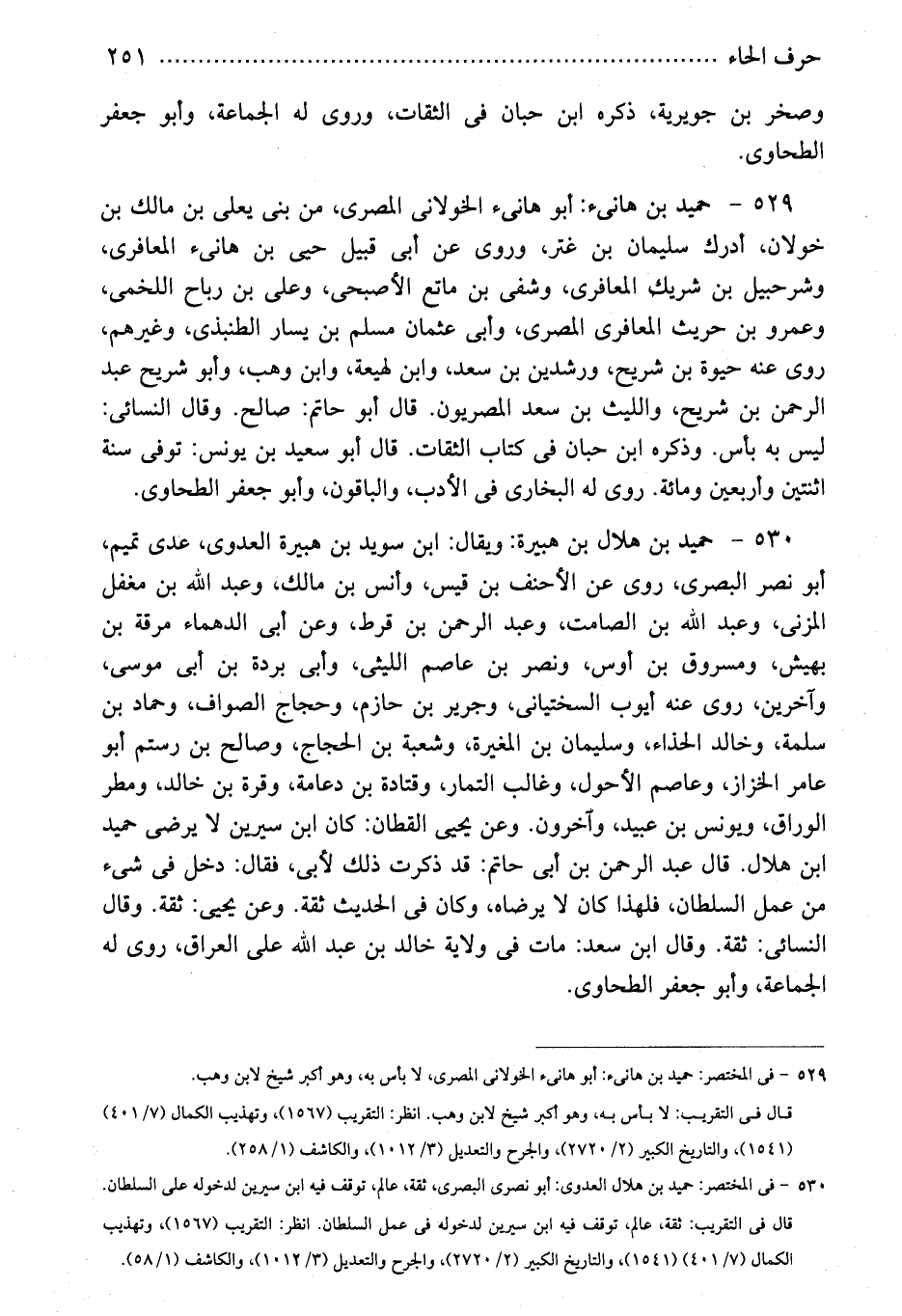 530 - حميد بن هلال بن هبيرة: ويقال: ابن سويد بن هبيرة العدوى، عدى تميم، أبو نصر البصرى، روى عن الأحنف بن قيس، وأنس بن مالك، وعبد الله بن مغفل المزنى، وعبد الله بن الصامت، وعبد الرحمن بن قرط، وعن أبى الدهماء مرقة بن بهيش، ومسروق بن أوس، ونصر بن عاصم الليثى، وأبى بردة بن أبى موسى، وآخرين، روى عنه أيوب السختيانى، وجرير بن حازم، وحجاج الصواف، وحماد بن سلمة، وخالد الحذاء، وسليمان بن المغيرة، وشعبة بن الحجاج، وصالح بن رستم أبو عامر الخزاز، وعاصم الأحول، وغالب التمار، وقتادة بن دعامة، وقرة بن خالد، ومطر الوراق، ويونس بن عبيد، وآخرون. وعن يحيى القطان: كان ابن سيرين لا يرضى حميد ابن هلال. قال عبد الرحمن بن أبى حاتم: قد ذكرت ذلك لأبى، فقال: دخل فى شىء من عمل السلطان، فلهذا كان لا يرضاه، وكان فى الحديث ثقة. وعن يحيى: ثقة. وقال النسائى: ثقة. وقال ابن سعد: مات فى ولاية خالد بن عبد الله على العراق، روى له الجماعة، وأبو جعفر الطحاوى.
