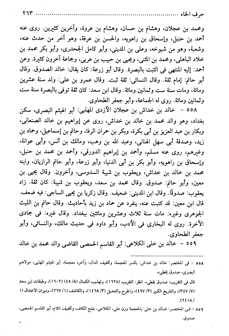 559 - فى المختصر: خالد بن خلى: بالمعجمة وزن على، الكلاعى، بفتح الكاف، وتخفيف اللام، أبو القاسم الحمصى، صدوق.