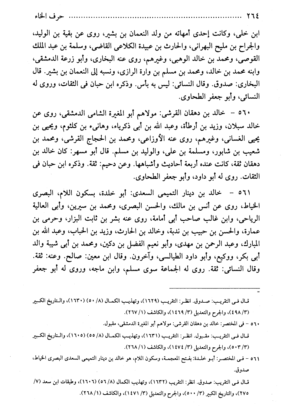 560 - خالد بن دهقان القرشى: مولاهم أبو المغيرة الشامى الدمشقى، روى عن خالد سبلان، وزيد بن أرطأة، وعبد الله بن أبى ذكرياء، وهانىء بن كلثوم، ويحيى بن يحيى الغسانى، وغيرهم، روى عنه الأوزاعى، ومحمد بن الحجاج القرشى، ومحمد بن شعيب بن شابور، ومسلمة بن على، والوليد بن مسلم. قال أبو مسهر: كان خالد بن دهقان ثقة، كانت عنده أربعة أحاديث وأشباهها. وعن دحيم: ثقة. وذكره ابن حبان فى الثقات. روى له أبو داود، وأبو جعفر الطحاوى.