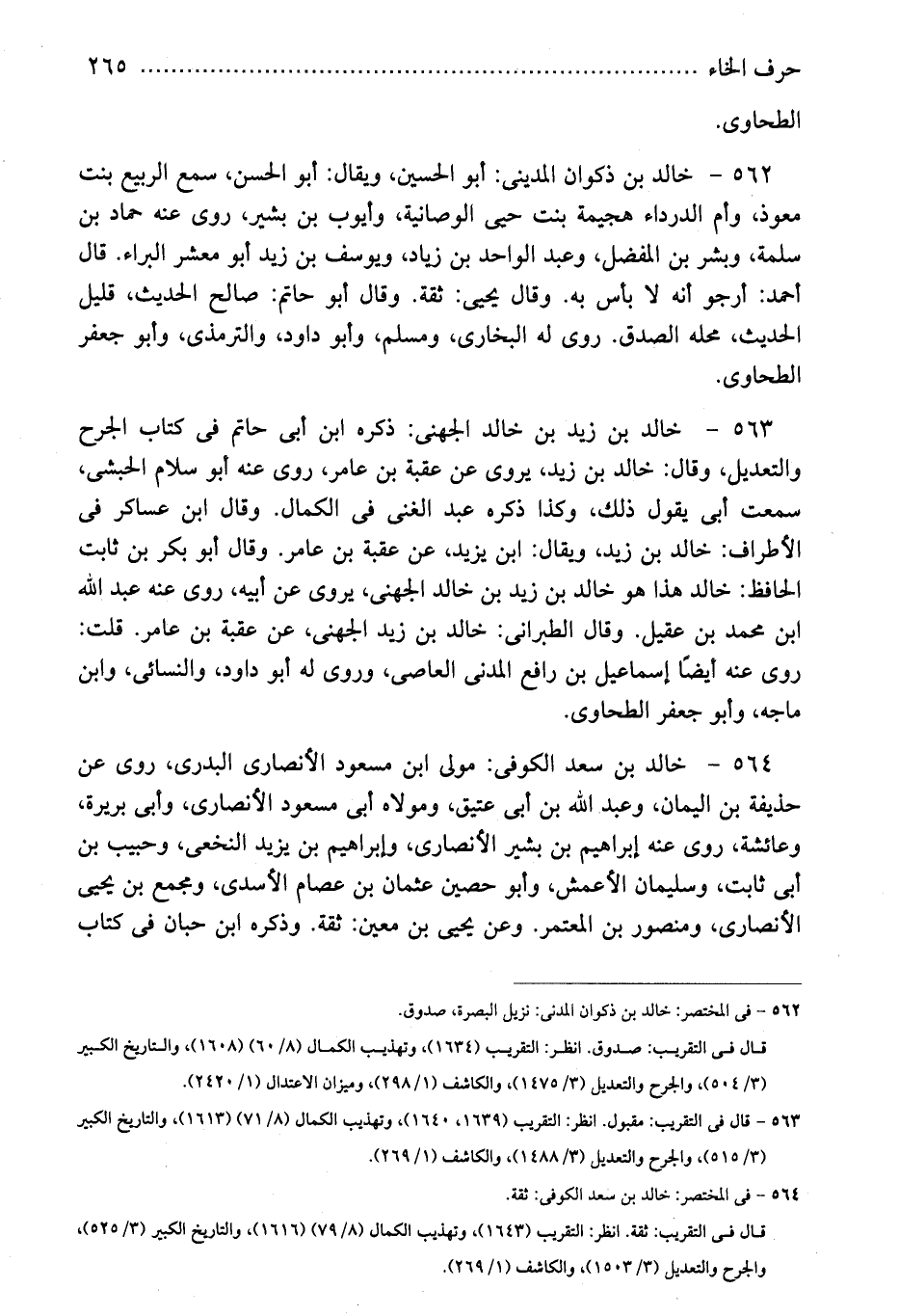 562 - خالد بن ذكوان المدينى: أبو الحسين، ويقال: أبو الحسن، سمع الربيع بنت معوذ، وأم الدرداء هجيمة بنت حيى الوصانية، وأيوب بن بشير، روى عنه حماد بن سلمة، وبشر بن المفضل، وعبد الواحد بن زياد، ويوسف بن زيد أبو معشر البراء. قال أحمد: أرجو أنه لا بأس به. وقال يحيى: ثقة. وقال أبو حاتم: صالح الحديث، قليل الحديث، محله الصدق. روى له البخارى، ومسلم، وأبو داود، والترمذى، وأبو جعفر الطحاوى.
