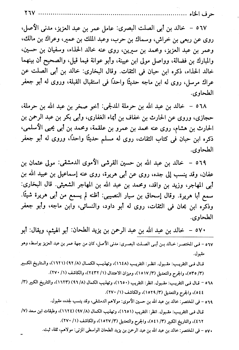 568 - خالد بن عبد الله بن حرملة المدلجى: أخو صخر بن عبد الله بن حرملة، حجازى، وروى عن الحارث بن خفاف بن أيماء الغفارى، وأبى بكر بن عبد الرحمن بن الحارث بن هشام، روى عنه محمد بن عمرو بن علقمة، ومحمد بن أبى يحيى الأسلمى، ذكره ابن حبان فى كتاب الثقات، روى له مسلم حديثًا واحدًا، وروى له أبو جعفر الطحاوى.