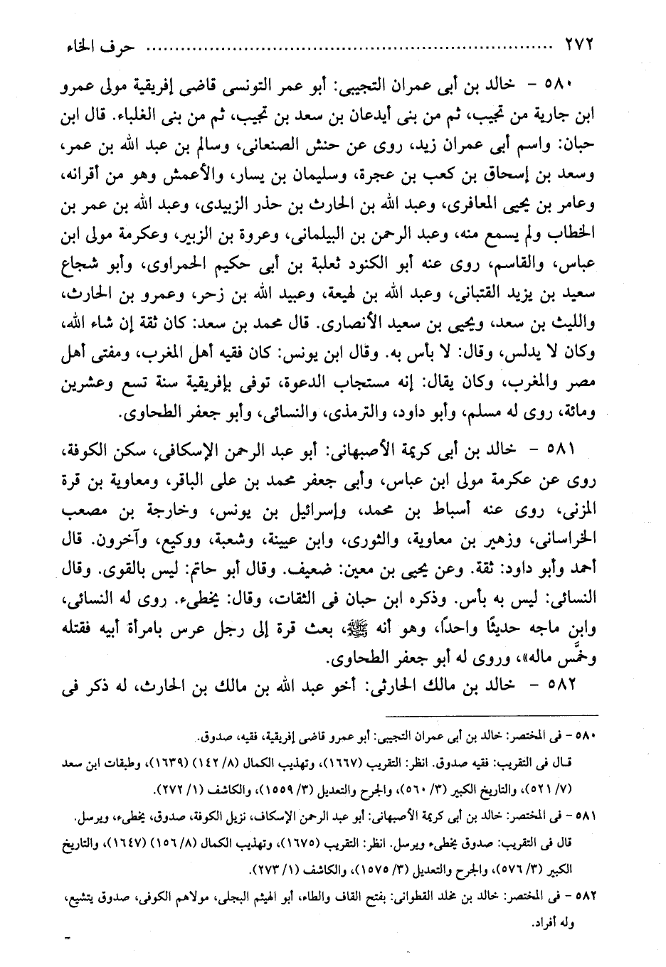 580 - خالد بن أبى عمران التجيبى: أبو عمر التونسى قاضى إفريقية مولى عمرو ابن جارية من تجيب، ثم من بنى أيدعان بن سعد بن تجيب، ثم من بنى الغلباء. قال ابن حبان: واسم أبى عمران زيد، روى عن حنش الصنعانى، وسالم بن عبد الله بن عمر، وسعد بن إسحاق بن كعب بن عجرة، وسليمان بن يسار، والأعمش وهو من أقرانه، وعامر بن يحيى المعافرى، وعبد الله بن الحارث بن حذر الزبيدى، وعبد الله بن عمر بن الخطاب ولم يسمع منه، وعبد الرحمن بن البيلمانى، وعروة بن الزبير، وعكرمة مولى ابن عباس، والقاسم، روى عنه أبو الكنود ثعلبة بن أبى حكيم الحمراوى، وأبو شجاع سعيد بن يزيد القتبانى، وعبد الله بن لهيعة، وعبيد الله بن زحر، وعمرو بن الحارث، والليث بن سعد، ويحيى بن سعيد الأنصارى. قال محمد بن سعد: كان ثقة إن شاء الله، وكان لا يدلس، وقال: لا بأس به. وقال ابن يونس: كان فقيه أهل المغرب، ومفتى أهل مصر والمغرب، وكان يقال: إنه مستجاب الدعوة، توفى بإفريقية سنة تسع وعشرين ومائة، روى له مسلم، وأبو داود، والترمذى، والنسائى، وأبو جعفر الطحاوى.