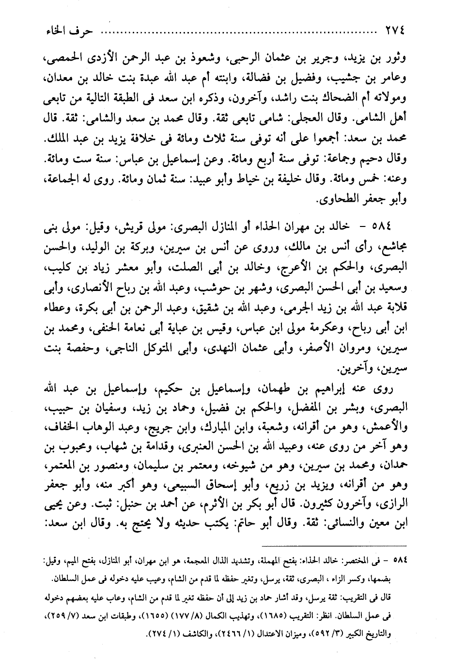 584 - خالد بن مهران الحذاء أو المنازل البصرى: مولى قريش، وقيل: مولى بنى مجاشع، رأى أنس بن مالك، وروى عن أنس بن سيرين، وبركة بن الوليد، والحسن البصرى، والحكم بن الأعرج، وخالد بن أبى الصلت، وأبو معشر زياد بن كليب، وسعيد بن أبى الحسن البصرى، وشهر بن حوشب، وعبد الله بن رباح الأنصارى، وأبى قلابة عبد الله بن زيد الجرمى، وعبد الله بن شقيق، وعبد الرحمن بن أبى بكرة، وعطاء ابن أبى رباح، وعكرمة مولى ابن عباس، وقيس بن عباية أبى نعامة الحنفى، ومحمد بن سيرين، ومروان الأصفر، وأبى عثمان النهدى، وأبى المتوكل الناجى، وحفصة بنت سيرين، وآخرين.