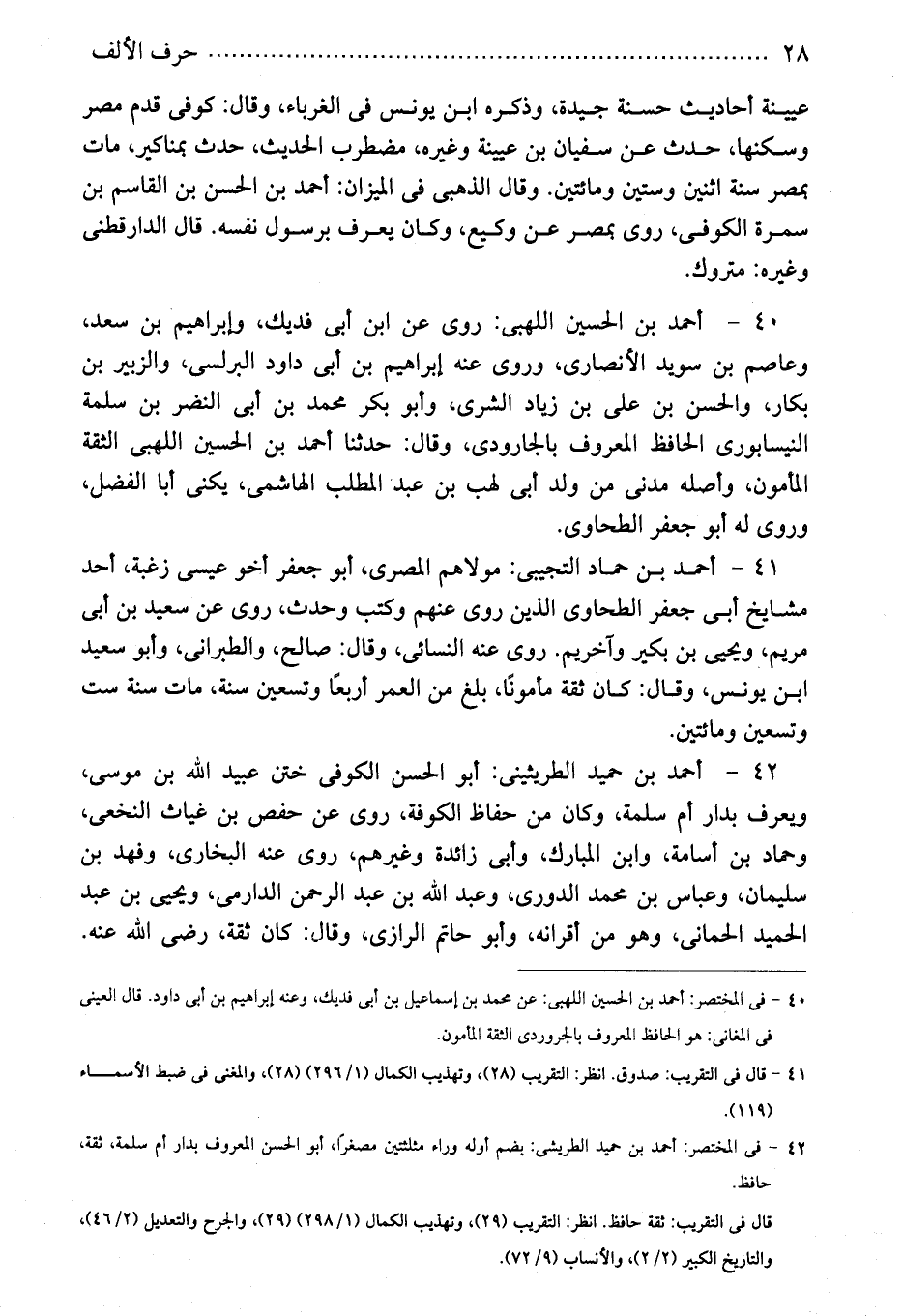 40 - فى المختصر: أحمد بن الحسين اللهبى: عن محمد بن إسماعيل بن أبى فديك، وعنه إبراهيم بن أبى داود. قال العينى فى المغانى: هو الحافظ المعروف بالجروردى الثقة المأمون.