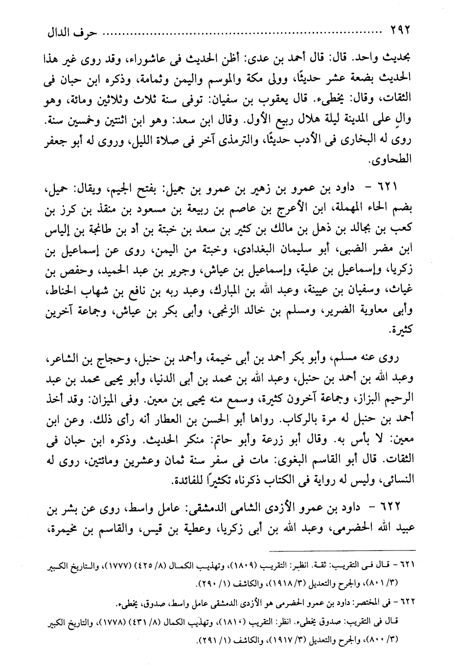 621 - داود بن عمرو بن زهير بن عمرو بن جميل: بفتح الجيم، ويقال: حميل، بضم الحاء المهملة، ابن الأعرج بن عاصم بن ربيعة بن مسعود بن منقذ بن كرز بن كعب بن بجالد بن ذهل بن مالك بن كثير بن سعد بن خبتة بن أد بن طانجة بن إلياس ابن مضر الضبى، أبو سليمان البغدادى، وخبتة من اليمن، روى عن إسماعيل بن زكريا، وإسماعيل بن علية، وإسماعيل بن عياش، وجرير بن عبد الحميد، وحفص بن غياث، وسفيان بن عيينة، وعبد الله بن المبارك، وعبد ربه بن نافع بن شهاب الحناط، وأبى معاوية الضرير، ومسلم بن خالد الزنجى، وأبى بكر بن عياش، وجماعة آخرين كثيرة.
