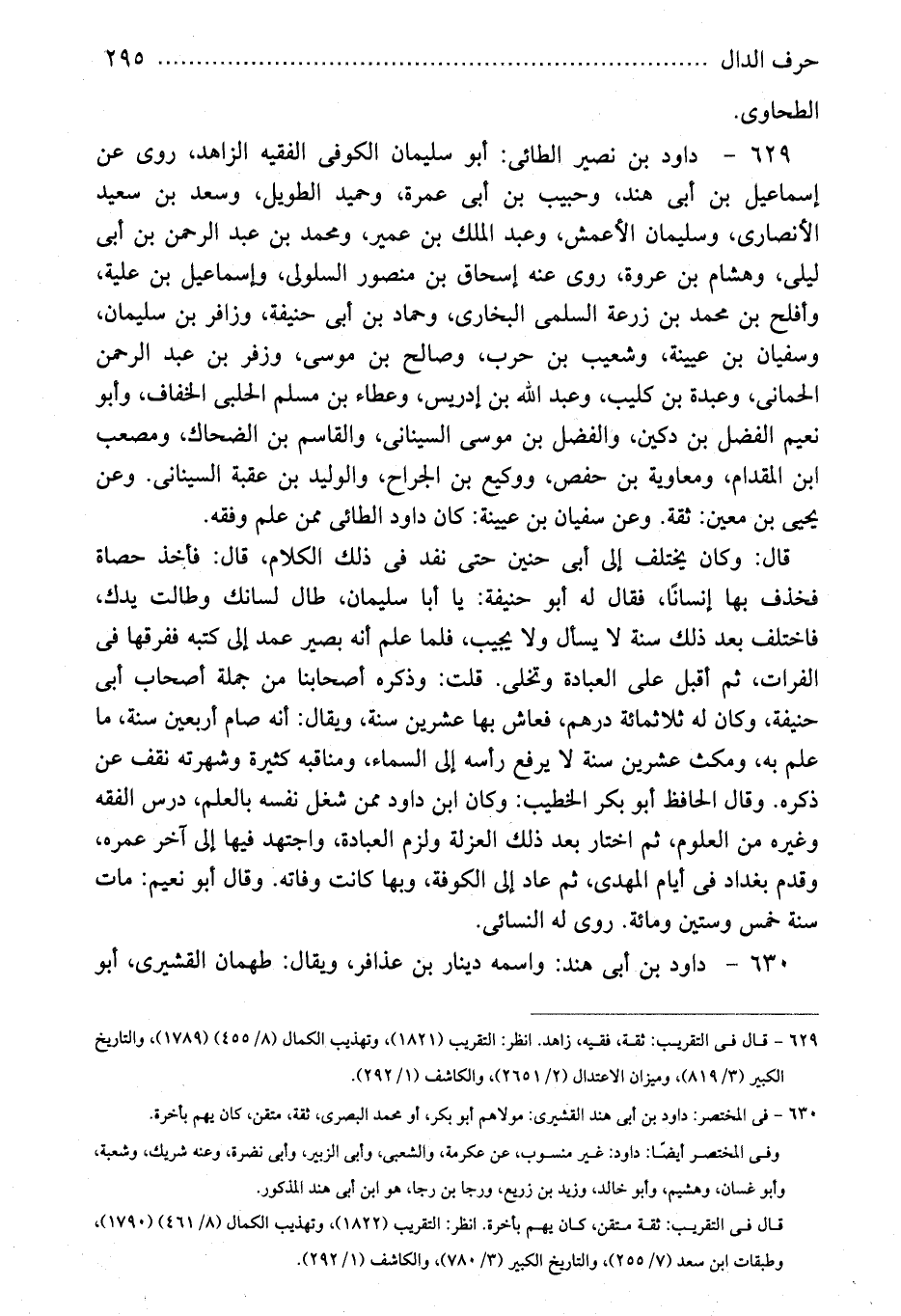629 - داود بن نصير الطائى: أبو سليمان الكوفى الفقيه الزاهد، روى عن إسماعيل بن أبى هند، وحبيب بن أبى عمرة، وحميد الطويل، وسعد بن سعيد الأنصارى، وسليمان الأعمش، وعبد الملك بن عمير، ومحمد بن عبد الرحمن بن أبى ليلى، وهشام بن عروة، روى عنه إسحاق بن منصور السلولى، وإسماعيل بن علية، وأفلح بن محمد بن زرعة السلمى البخارى، وحماد بن أبى حنيفة، وزافر بن سليمان، وسفيان بن عيينة، وشعيب بن حرب، وصالح بن موسى، وزفر بن عبد الرحمن الحمانى، وعبدة بن كليب، وعبد الله بن إدريس، وعطاء بن مسلم الحلبى الخفاف، وأبو نعيم الفضل بن دكين، والفضل بن موسى السينانى، والقاسم بن الضحاك، ومصعب ابن المقدام، ومعاوية بن حفص، ووكيع بن الجراح، والوليد بن عقبة السينانى. وعن يحيى بن معين: ثقة. وعن سفيان بن عيينة: كان داود الطائى ممن علم وفقه.