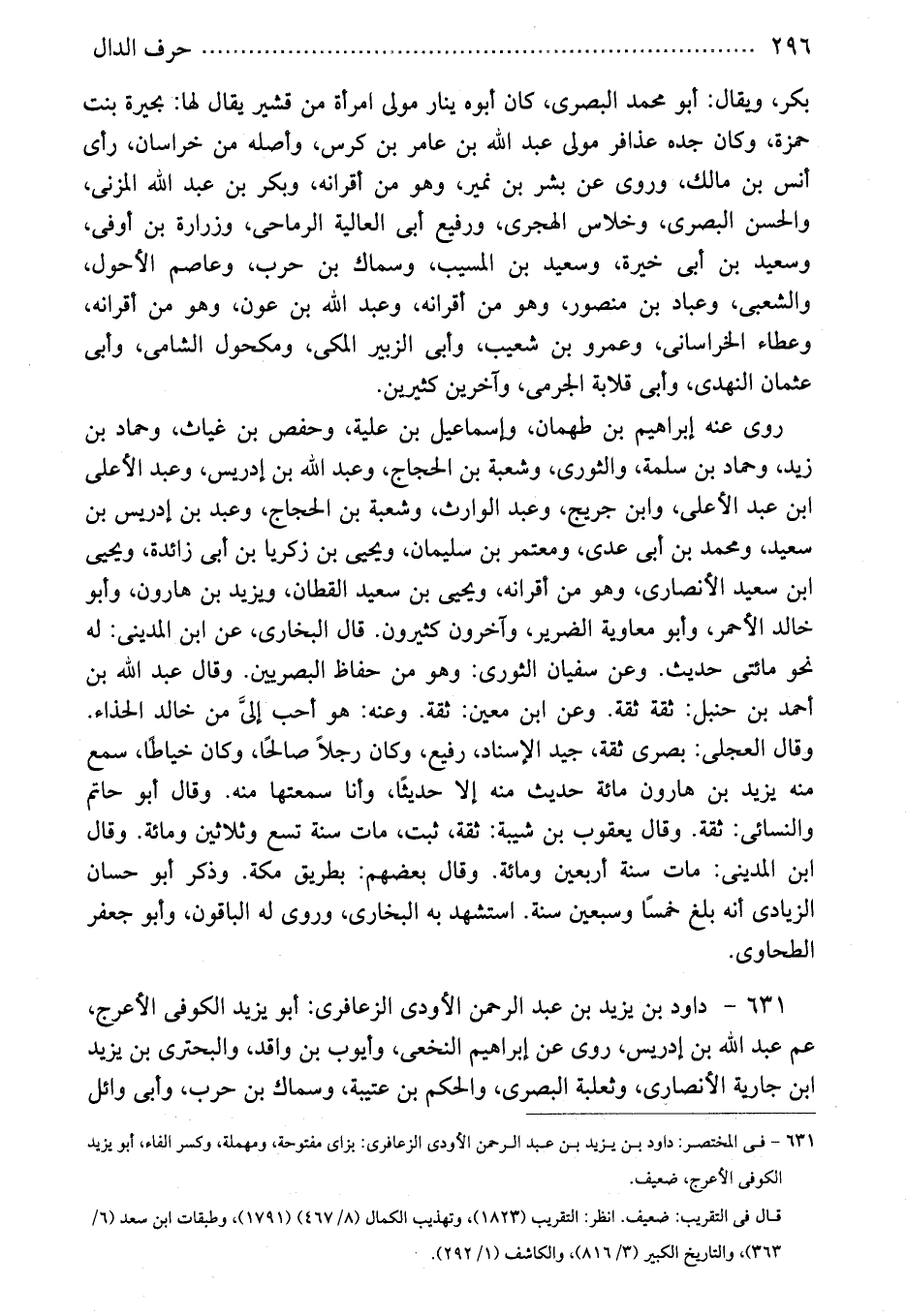 631 - داود بن يزيد بن عبد الرحمن الأودى الزعافرى: أبو يزيد الكوفى الأعرج، عم عبد الله بن إدريس، روى عن إبراهيم النخعى، وأيوب بن واقد، والبحترى بن يزيد ابن جارية الأنصارى، وثعلبة البصرى، والحكم بن عتيبة، وسماك بن حرب، وأبى وائل
