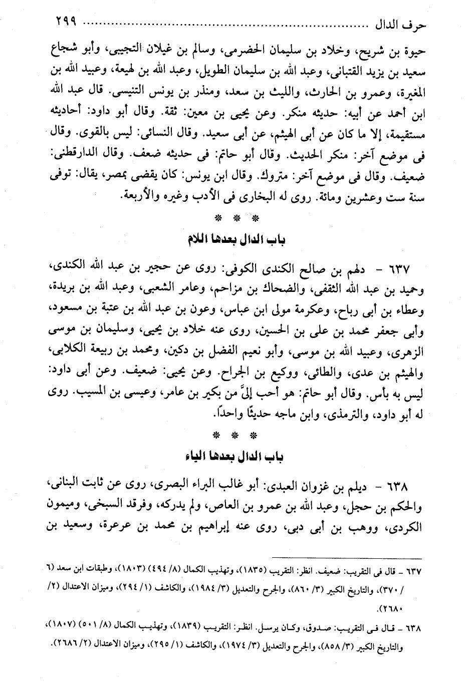 637 - دلهم بن صالح الكندى الكوفى: روى عن حجير بن عبد الله الكندى، وحميد بن عبد الله الثقفى، والضحاك بن مزاحم، وعامر الشعبى، وعبد الله بن بريدة، وعطاء بن أبى رباح، وعكرمة مولى ابن عباس، وعون بن عبد الله بن عتبة بن مسعود، وأبى جعفر محمد بن على بن الحسين، روى عنه خلاد بن يحيى، وسليمان بن موسى الزهرى، وعبيد الله بن موسى، وأبو نعيم الفضل بن دكين، ومحمد بن ربيعة الكلابى، والهيثم بن عدى، والطائى، ووكيع بن الجراح. وعن يحيى: ضعيف. وعن أبى داود: ليس به بأس. وقال أبو حاتم: هو أحب إلىَّ من بكير بن عامر، وعيسى بن المسيب. روى له أبو داود، والترمذى، وابن ماجه حديثًا واحدًا.