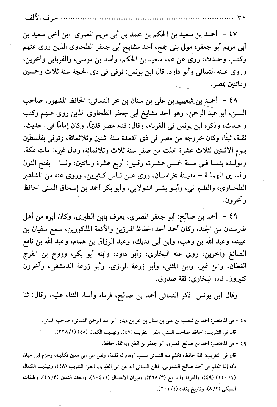 49 - أحمد بن صالح: أبو جعفر المصرى، يعرف بابن الطبرى، وكان أبوه من أهل طبرستان من الجند، وكان أحمد أحد الحفاظ المبرزين والأئمة المذكورين، سمع سفيان بن عيينة، وعبد الله بن وهب، وابن أبى فديك، وعبد الرزاق بن همام، وعبد الله بن نافع الصائغ وآخرين، روى عنه البخارى، وأبو داود، وابنه أبو بكر، وروح بن الفرج القطان، وابن نمير، وابن المثنى، وأبو زرعة الرازى، وأبو زرعة الدمشقى، وآخرون كثيرون. قال البخارى: ثقة صدوق.