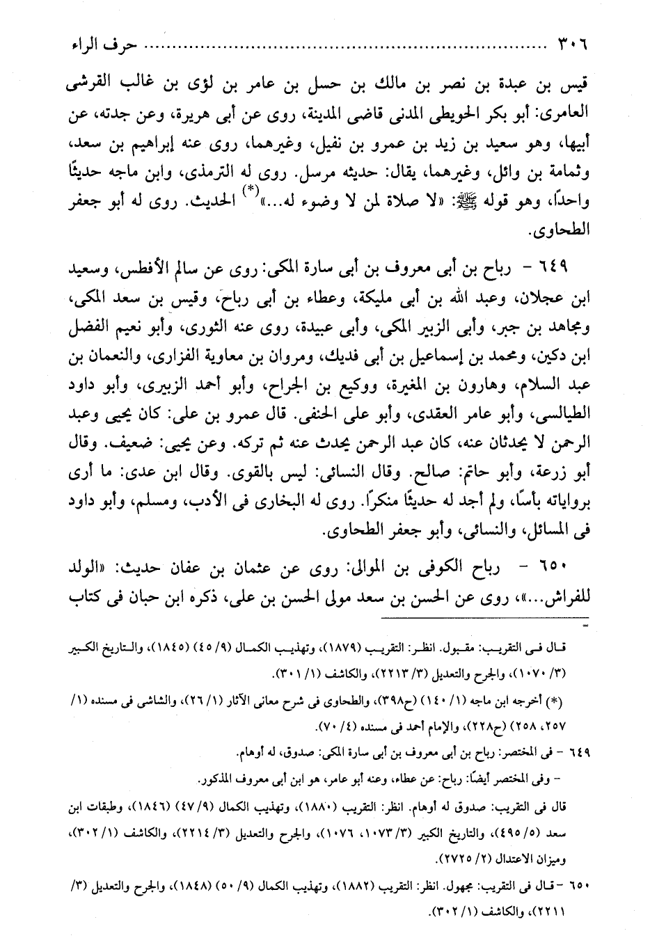 649 - رباح بن أبى معروف بن أبى سارة المكى: روى عن سالم الأفطس، وسعيد ابن عجلان، وعبد الله بن أبى مليكة، وعطاء بن أبى رباح، وقيس بن سعد المكى، ومجاهد بن جبر، وأبى الزبير المكى، وأبى عبيدة، روى عنه الثورى، وأبو نعيم الفضل ابن دكين، ومحمد بن إسماعيل بن أبى فديك، ومروان بن معاوية الفزارى، والنعمان بن عبد السلام، وهارون بن المغيرة، ووكيع بن الجراح، وأبو أحمد الزبيرى، وأبو داود الطيالسى، وأبو عامر العقدى، وأبو على الحنفى. قال عمرو بن على: كان يحيى وعبد الرحمن لا يحدثان عنه، كان عبد الرحمن يحدث عنه ثم تركه. وعن يحيى: ضعيف. وقال أبو زرعة، وأبو حاتم: صالح. وقال النسائى: ليس بالقوى. وقال ابن عدى: ما أرى برواياته بأسًا، ولم أجد له حديثًا منكرًا. روى له البخارى فى الأدب، ومسلم، وأبو داود فى المسائل، والنسائى، وأبو جعفر الطحاوى.