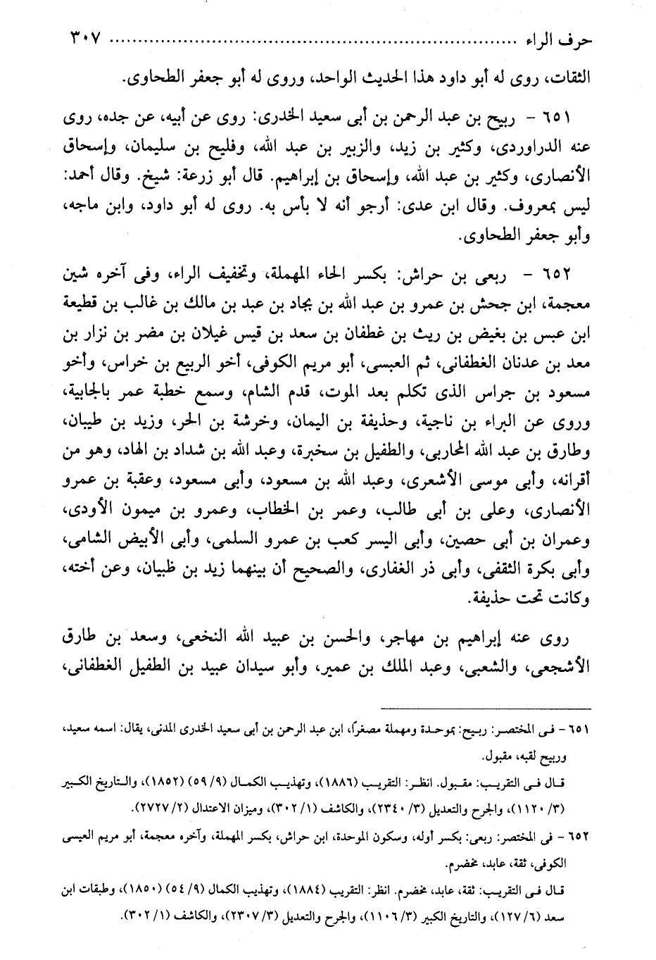 651 - ربيح بن عبد الرحمن بن أبى سعيد الخدرى: روى عن أبيه، عن جده، روى عنه الدراوردى، وكثير بن زيد، والزبير بن عبد الله، وفليح بن سليمان، وإسحاق الأنصارى، وكثير بن عبد الله، وإسحاق بن إبراهيم. قال أبو زرعة: شيخ. وقال أحمد: ليس بمعروف. وقال ابن عدى: أرجو أنه لا بأس به. روى له أبو داود، وابن ماجه، وأبو جعفر الطحاوى.