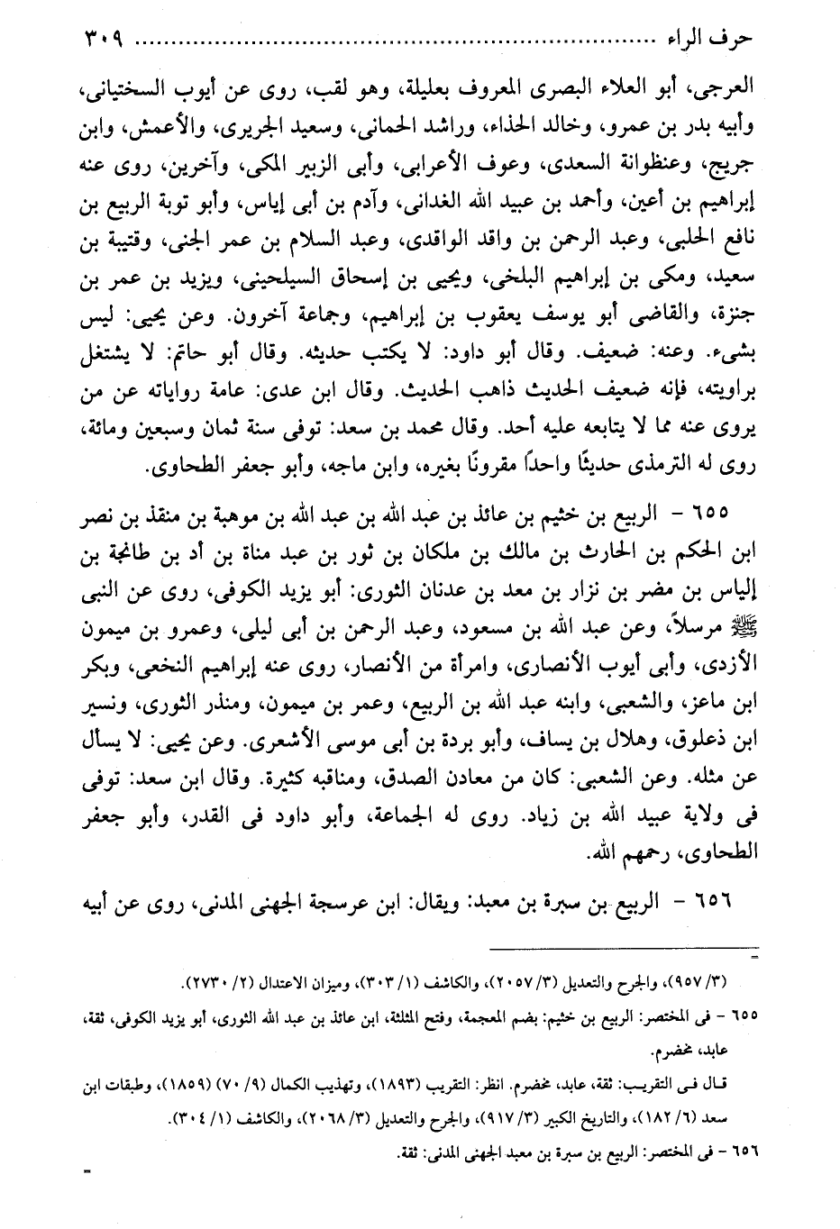 655 - الربيع بن خثيم بن عائذ بن عبد الله بن عبد الله بن موهبة بن منقذ بن نصر ابن الحكم بن الحارث بن مالك بن ملكان بن ثور بن عبد مناة بن أد بن طانجة بن إلياس بن مضر بن نزار بن معد بن عدنان الثورى: أبو يزيد الكوفى، روى عن النبى - صلى الله عليه وسلم - مرسلاً، وعن عبد الله بن مسعود، وعبد الرحمن بن أبى ليلى، وعمرو بن ميمون الأزدى، وأبى أيوب الأنصارى، وامرأة من الأنصار، روى عنه إبراهيم النخعى، وبكر ابن ماعز، والشعبى، وابنه عبد الله بن الربيع، وعمر بن ميمون، ومنذر الثورى، ونسير ابن ذعلوق، وهلال بن يساف، وأبو بردة بن أبى موسى الأشعرى. وعن يحيى: لا يسأل عن مثله. وعن الشعبى: كان من معادن الصدق، ومناقبه كثيرة. وقال ابن سعد: توفى فى ولاية عبيد الله بن زياد. روى له الجماعة، وأبو داود فى القدر، وأبو جعفر الطحاوى، رحمهم الله.