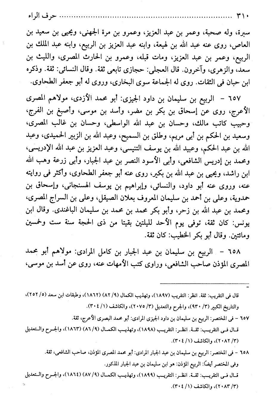 658 - الربيع بن سليمان بن عبد الجبار بن كامل المرادى: مولاهم أبو محمد المصرى المؤذن صاحب الشافعى، وراوى كتب الأمهات عنه، روى عن أسد بن موسى،