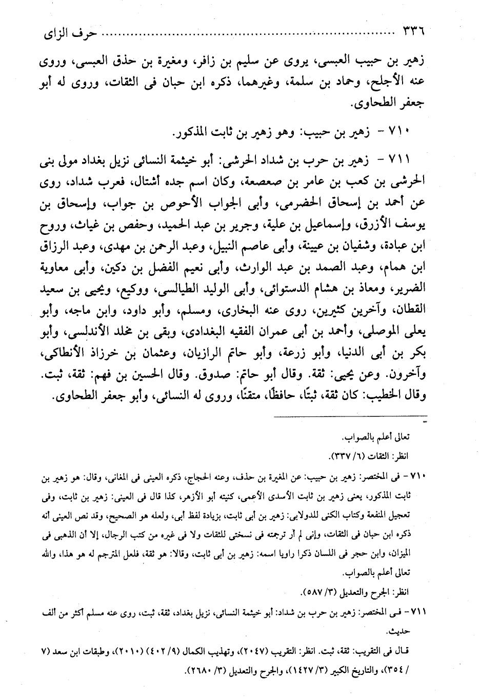 711 - زهير بن حرب بن شداد الحرشى: أبو خيثمة النسائى نزيل بغداد مولى بنى الحرشى بن كعب بن عامر بن صعصعة، وكان اسم جده أشتال، فعرب شداد، روى عن أحمد بن إسحاق الحضرمى، وأبى الجواب الأحوص بن جواب، وإسحاق بن يوسف الأزرق، وإسماعيل بن علية، وجرير بن عبد الحميد، وحفص بن غياث، وروح ابن عبادة، وشفيان بن عيينة، وأبى عاصم النبيل، وعبد الرحمن بن مهدى، وعبد الرزاق ابن همام، وعبد الصمد بن عبد الوارث، وأبى نعيم الفضل بن دكين، وأبى معاوية الضرير، ومعاذ بن هشام الدستوائى، وأبى الوليد الطيالسى، ووكيع، ويحيى بن سعيد القطان، وآخرين كثيرين، روى عنه البخارى، ومسلم، وأبو داود، وابن ماجه، وأبو يعلى الموصلى، وأحمد بن أبى عمران الفقيه البغدادى، وبقى بن مخلد الأندلسى، وأبو بكر بن أبى الدنيا، وأبو زرعة، وأبو حاتم الرازيان، وعثمان بن خرزاذ الأنطاكى، وآخرون. وعن يحيى: ثقة. وقال أبو حاتم: صدوق. وقال الحسين بن فهم: ثقة، ثبت. وقال الخطيب: كان ثقة، ثبتًا، حافظًا، متقنًا، وروى له النسائى، وأبو جعفر الطحاوى.