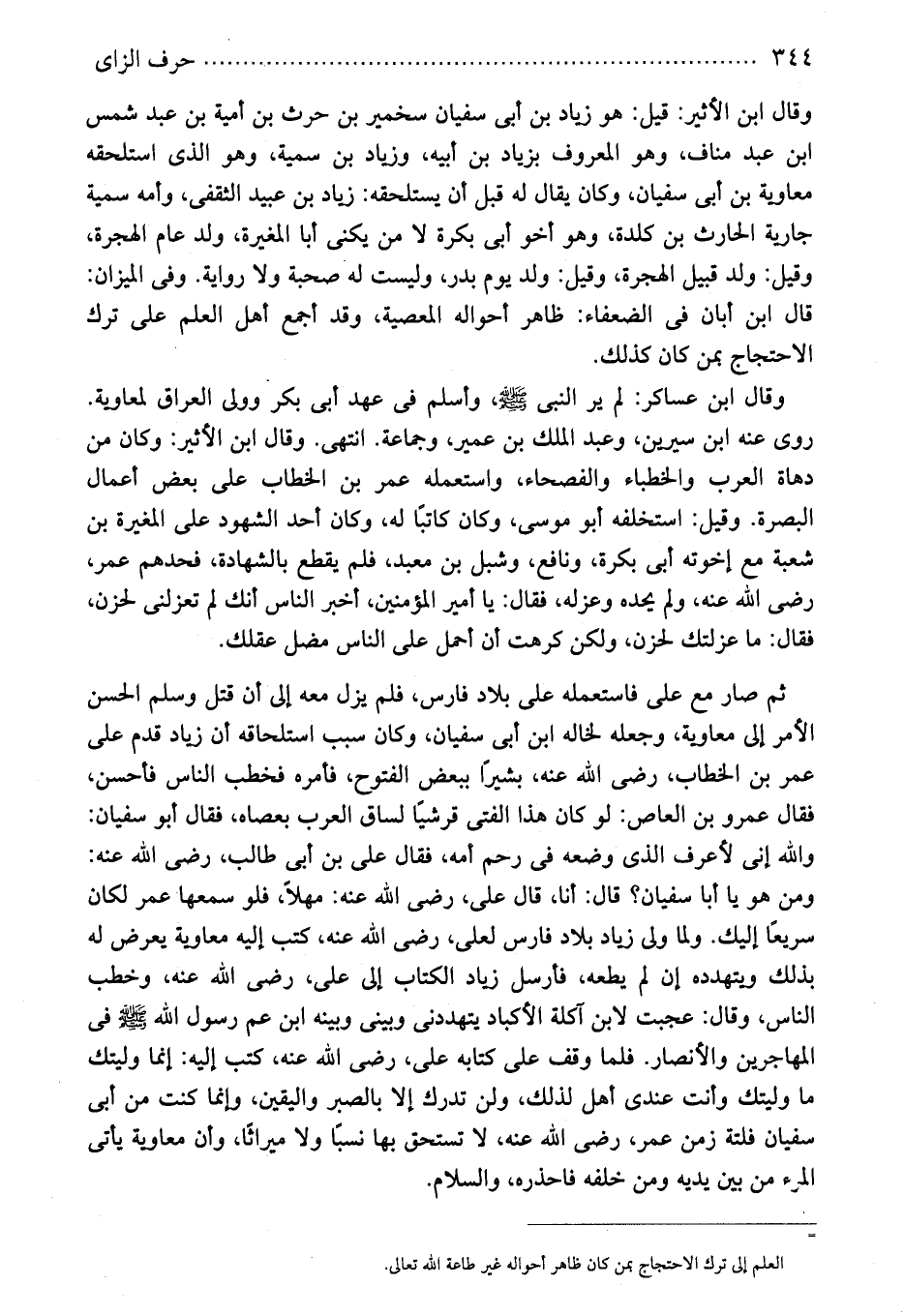 وقال ابن الأثير: قيل: هو زياد بن أبى سفيان سخمير بن حرث بن أمية بن عبد شمس ابن عبد مناف، وهو المعروف بزياد بن أبيه، وزياد بن سمية، وهو الذى استلحقه معاوية بن أبى سفيان، وكان يقال له قبل أن يستلحقه: زياد بن عبيد الثقفى، وأمه سمية جارية الحارث بن كلدة، وهو أخو أبى بكرة لا من يكنى أبا المغيرة، ولد عام الهجرة، وقيل: ولد قبيل الهجرة، وقيل: ولد يوم بدر، وليست له صحبة ولا رواية. وفى الميزان: قال ابن أبان فى الضعفاء: ظاهر أحواله المعصية، وقد أجمع أهل العلم على ترك الاحتجاج بمن كان كذلك.