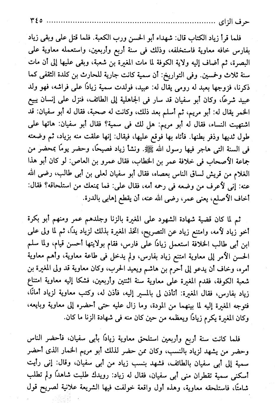 فلما قرأ زياد الكتاب قال: شهداء أبو الحسن ورب الكعبة. فلما قتل على وبقى زياد بفارس خافه معاوية فاستخلفه، وذلك فى سنة أربع وأربعين، واستعمله معاوية على البصرة، ثم أضاف إليه ولاية الكوفة لما مات المغيرة بن شعبة، وبقى عليها إلى أن مات سنة ثلاث وخمسين. وفى التواريخ: أن سمية كانت جارية للحارث بن كلدة الثقفى كما ذكرنا، فزوجها بعبد له رومى يقال له: عبيد، فولدت سمية زيادًا على فراشه، فهو ولد عبيد شرعًا، وكان أبو سفيان قد سار فى الجاهلية إلى الطائف، فنزل على إنسان يبيع الخمر يقال له: أبو مريم، ثم أسلم بعد ذلك، وكانت له صحبة، فقال له أبو سفيان: قد اشتهيت النساء، فقال له أبو مريم: هل لك فى سمية؟ فقال أبو سفيان: هاتها على طول ثديها وذفر بطنها. فأتاه بها فوقع عليها، فيقال: إنها علقت منه بزياد، ثم وضعته فى السنة التى هاجر فيها رسول الله - صلى الله عليه وسلم -. ونشأ زياد فصيحًا، وحضر يومًا بمحضر من جماعة الأصحاب فى خلافة عمر بن الخطاب، فقال عمرو بن العاص: لو كان أبو هذا الغلام من قريش لساق الناس بعصاه، فقال أبو سفيان لعلى بن أبى طالب، رضى الله عنه: إنى لأعرف من وضعه فى رحمه أمه، فقال على: فما يمنعك من استلحاقه؟ فقال: أخاف الأصلع، يعنى عمر، رضى الله عنه، أن يقطع إهابى بالدرة.