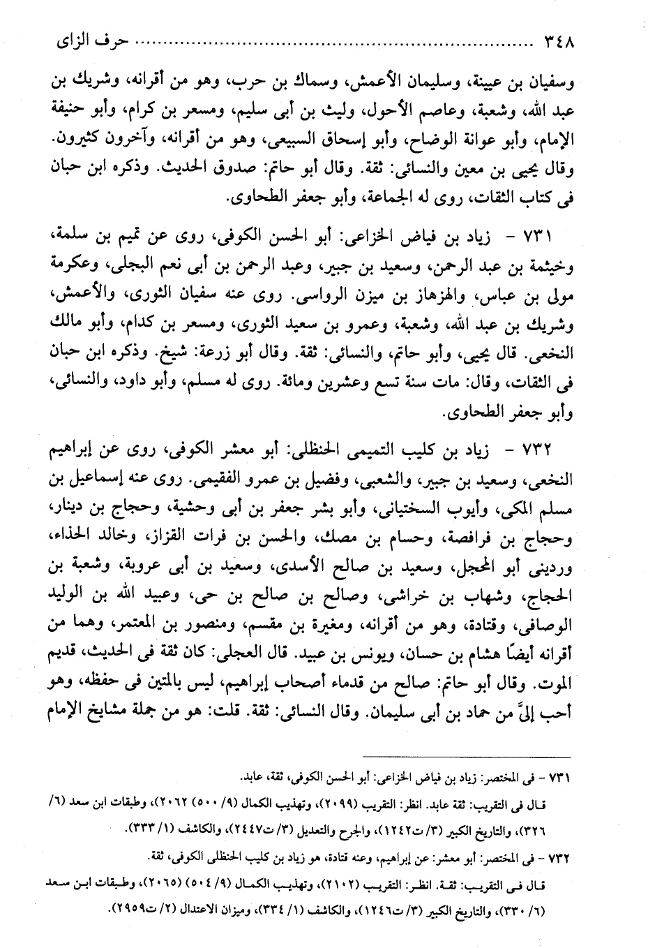 732 - زياد بن كليب التميمى الحنظلى: أبو معشر الكوفى، روى عن إبراهيم النخعى، وسعيد بن جبير، والشعبى، وفضيل بن عمرو الفقيمى. روى عنه إسماعيل بن مسلم المكى، وأيوب السختيانى، وأبو بشر جعفر بن أبى وحشية، وحجاج بن دينار، وحجاج بن فرافصة، وحسام بن مصك، والحسن بن فرات القزاز، وخالد الحذاء، وردينى أبو المحجل، وسعيد بن صالح الأسدى، وسعيد بن أبى عروبة، وشعبة بن الحجاج، وشهاب بن خراشى، وصالح بن صالح بن حى، وعبيد الله بن الوليد الوصافى، وقتادة، وهو من أقرانه، ومغيرة بن مقسم، ومنصور بن المعتمر، وهما من أقرانه أيضًا هشام بن حسان، ويونس بن عبيد. قال العجلى: كان ثقة فى الحديث، قديم الموت. وقال أبو حاتم: صالح من قدماء أصحاب إبراهيم، ليس بالمتين فى حفظه، وهو أحب إلىَّ من حماد بن أبى سليمان. وقال النسائى: ثقة. قلت: هو من جملة مشايخ الإمام
