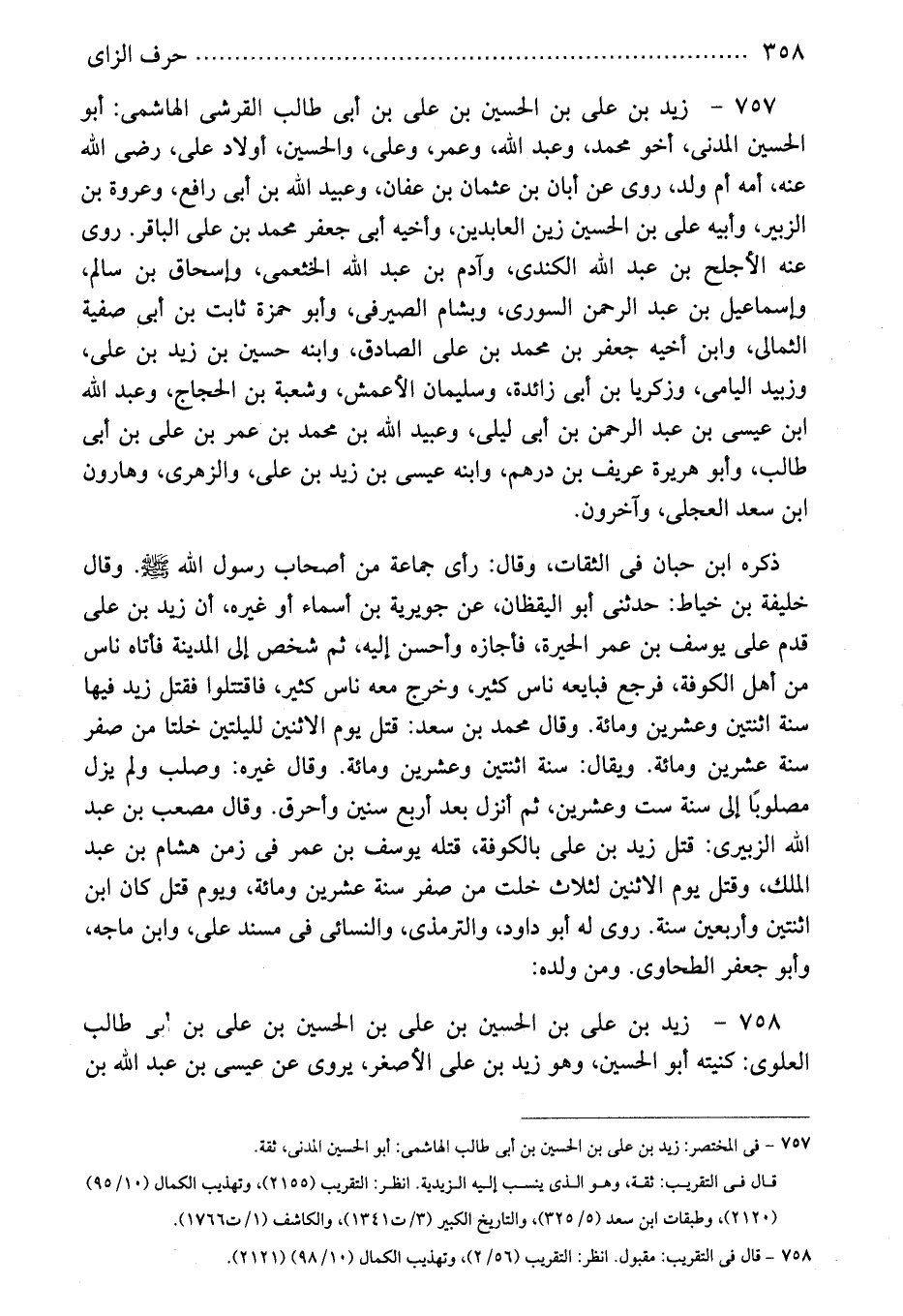 757 - زيد بن على بن الحسين بن على بن أبى طالب القرشى الهاشمى: أبو الحسين المدنى، أخو محمد، وعبد الله، وعمر، وعلى، والحسين، أولاد على، رضى الله عنه، أمه أم ولد، روى عن أبان بن عثمان بن عفان، وعبيد الله بن أبى رافع، وعروة بن الزبير، وأبيه على بن الحسين زين العابدين، وأخيه أبى جعفر محمد بن على الباقر. روى عنه الأجلح بن عبد الله الكندى، وآدم بن عبد الله الخثعمى، وإسحاق بن سالم، وإسماعيل بن عبد الرحمن السورى، وبشام الصيرفى، وأبو حمزة ثابت بن أبى صفية الثمالى، وابن أخيه جعفر بن محمد بن على الصادق، وابنه حسين بن زيد بن على، وزبيد اليامى، وزكريا بن أبى زائدة، وسليمان الأعمش، وشعبة بن الحجاج، وعبد الله ابن عيسى بن عبد الرحمن بن أبى ليلى، وعبيد الله بن محمد بن عمر بن على بن أبى طالب، وأبو هريرة عريف بن درهم، وابنه عيسى بن زيد بن على، والزهرى، وهارون ابن سعد العجلى، وآخرون.