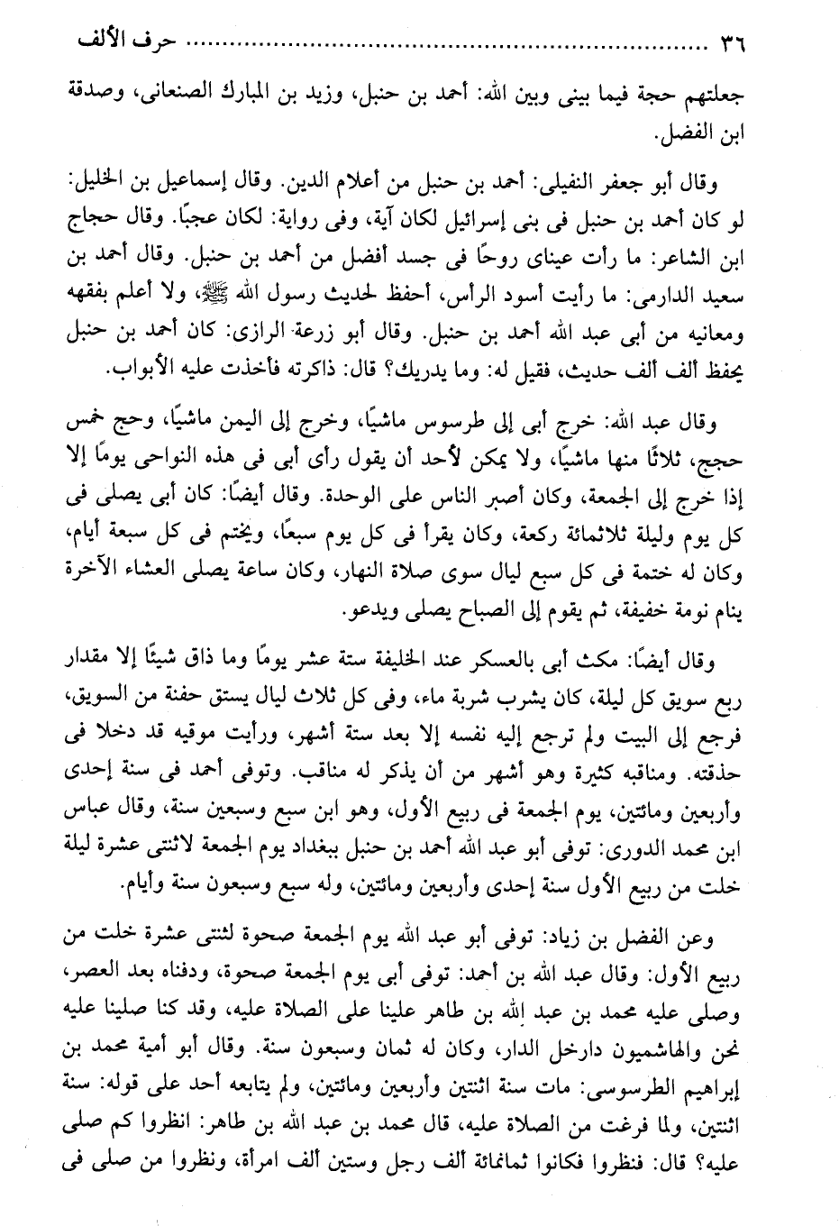 وقال أيضًا: مكث أبى بالعسكر عند الخليفة ستة عشر يومًا وما ذاق شيئًا إلا مقدار ربع سويق كل ليلة، كان يشرب شربة ماء، وفى كل ثلاث ليال يستق حفنة من السويق، فرجع إلى البيت ولم ترجع إليه نفسه إلا بعد ستة أشهر، ورأيت موقيه قد دخلا فى حذقته. ومناقبه كثيرة وهو أشهر من أن يذكر له مناقب. وتوفى أحمد فى سنة إحدى وأربعين ومائتين، يوم الجمعة فى ربيع الأول، وهو ابن سبع وسبعين سنة، وقال عباس ابن محمد الدورى: توفى أبو عبد الله أحمد بن حنبل ببغداد يوم الجمعة لاثنتى عشرة ليلة خلت من ربيع الأول سنة إحدى وأربعين ومائتين، وله سبع وسبعون سنة وأيام.