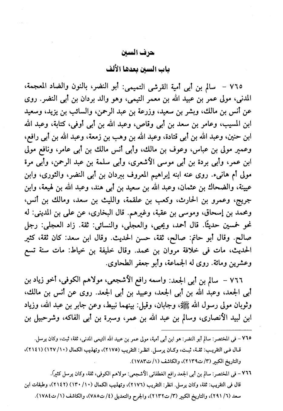765 - فى المختصر: سالم أبو النضر: هو ابن أبى أمية، مولى عمر بن عبيد الله التيمى المدنى، ثقة، ثبت، وكان يرسل.
