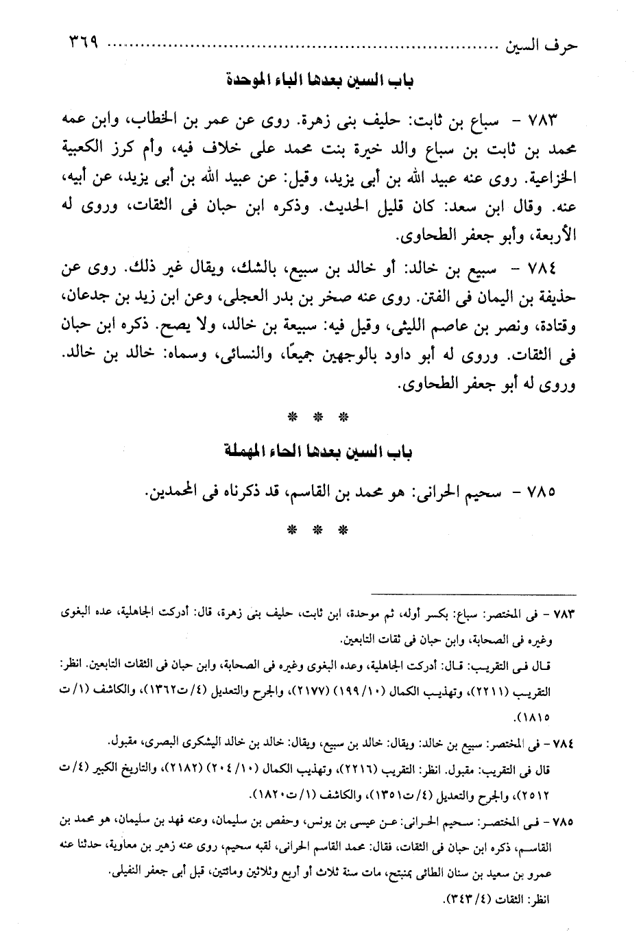 783 - فى المختصر: سباع: بكسر أوله، ثم موحدة، ابن ثابت، حليف بنى زهرة، قال: أدركت الجاهلية، عده البغوى وغيره فى الصحابة، وابن حبان فى ثقات التابعين.